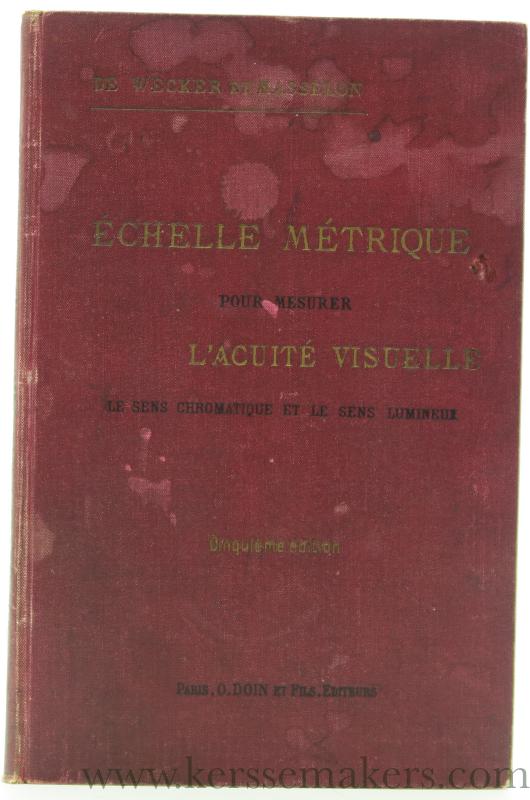 8vo (24x16 cm. Orig. printed publisher's cloth (spots on first cover; a few sl. rubbings). 4 leaves: blank leaf, halftitle., title and 1 leaf "À la mémoire de Édouard de Jaeger"), 36 leaves with "Echelles" in different languages, at the end 1 leaf with plate in colours "Cécité des couleurs, d'après Holmgren", 1 suppl. plate "Echelles" and 2 plates (1 double-page) with annotated music.