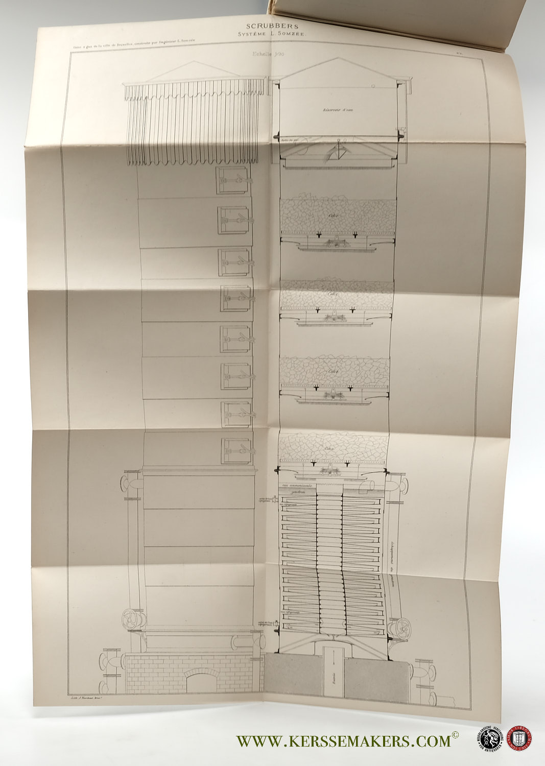 Small 8vo (17x11 cm). orig. printed cardboard wrappers, paper spine (sl. imperf.). 60 pp. With orig. photographs and lithographed plates. - Seven chapters about the excursions: - 1) Travaux de la Senne et réseau générale des égouts. 16 pp. and folding plate (photolithography) 'Plan de Bruxelles avec le tracé des collecteurs et de la Senne dérivée, wagon-vanne de Cazenave & section du voûtement de la Senne'. - 2) Notes sur les tramways de Bruxelles. 4 pp. - 3)Usine à gaz de Bruxelles établie à Laeken. 10 pp. and 6 large folding lithographs by J. Marchant, in 10 segments (c.32x50 cm. each): a) Plan de l'usine, b-f) sections of machines Système Somzée: Fours, Scrubbers, Épurateurs & Gazomètre, g) Extracteur à Gaz système Schmitz. (each plate with tear in 1 folt). - 4)Compagnie générale de touage. 4 pp. - 5) Manufacture générale de caoutchouc de Eug. Pavoux & Cie. 4 pp. and orig. photograph pasted in on cardboard 'Vue générale intérieure..' - 6) Fabrique de céruse de Émile Fastré. 4 pp. - 7) Brasserie Bavaro-Belge établie à Anderlecht. 12 pp. and orig. photograph pasted in on cardboard: view of the brewery. - Good copy, rare