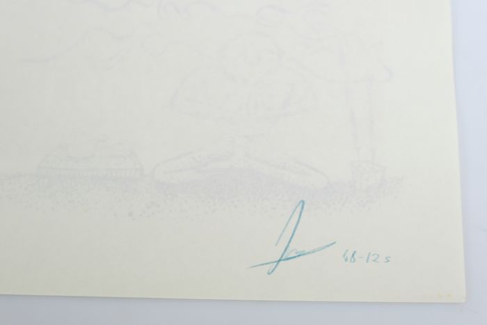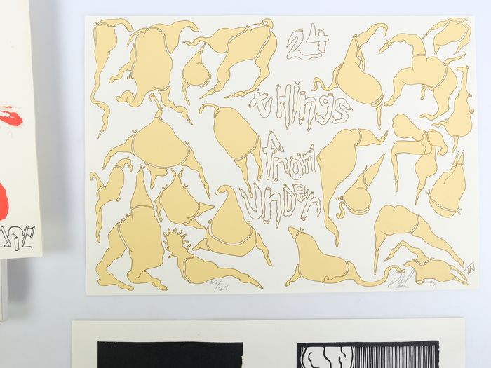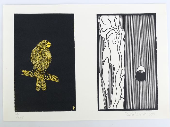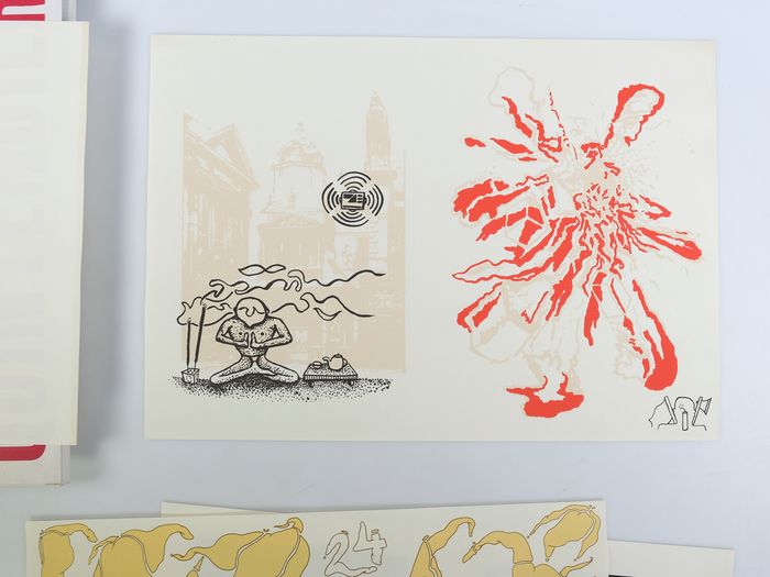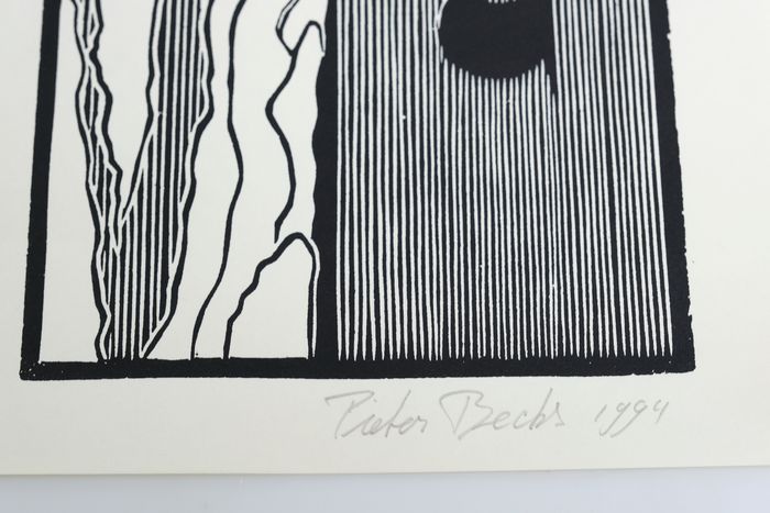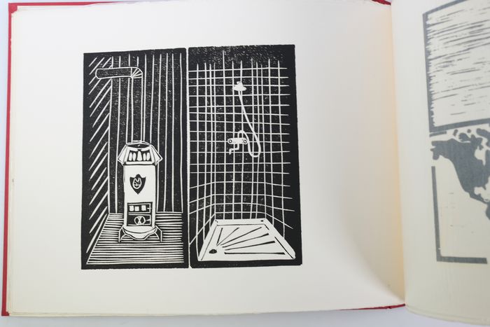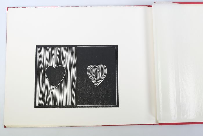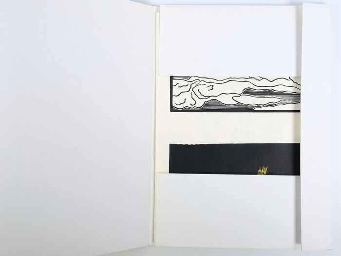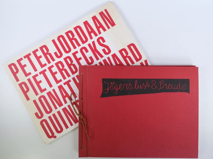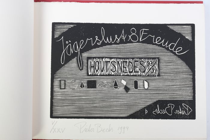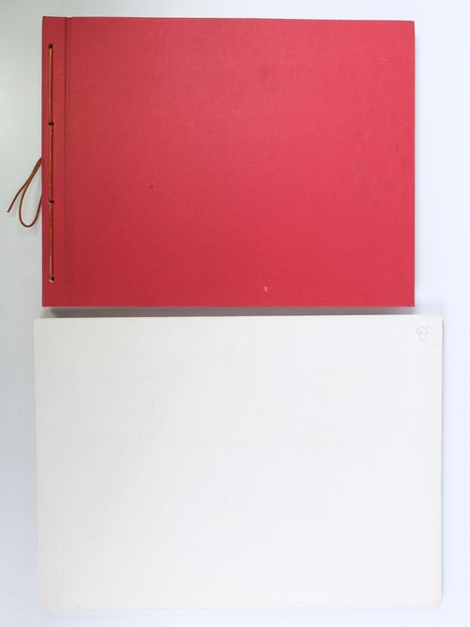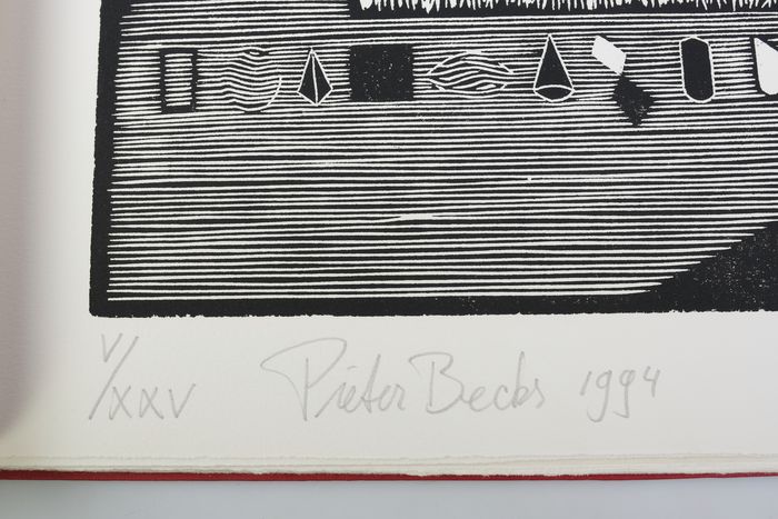 Red cloth-covered boards kept together with a string as issued; 30x39 cm., title-page, 10 (double/folded) leaves with 20, including 3 colour woodcuts, first woodcut signed, numbered V/XXV, dated 1994. ISBN 9050420753. Limited edition of only 25 copies! ADDED: Portfolio (portfolio bit spotted) with 4 original prints from Peter Jordaan, Pieter becks, Jonathan Ward & Quinten Dierick; 42x29.5 cm. All 4 prints signed and numbered 48/125 and dated 1994. (total weight is 1.26 kg) Text in Dutch. Very good, see pictures