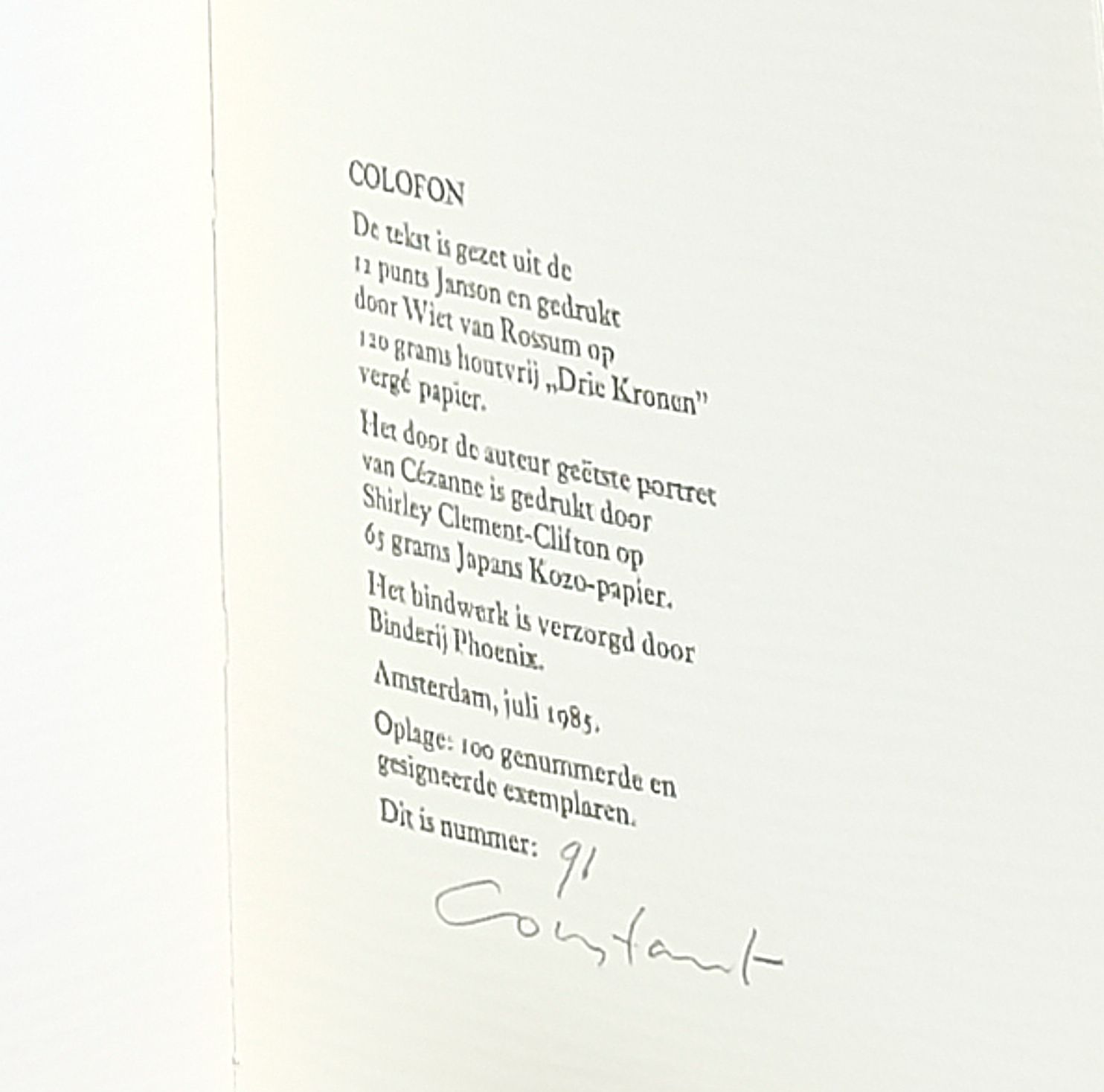 White blind wrappers with blue dust-jacket. 28 pp.; 20x13 cm. The frontispiece is an etching with the portrait of Cezanne by Constant on 65 grams Japanese Kozo paper [etching 7x5 cm]. Text in Dutch. Fine condition, see pictures