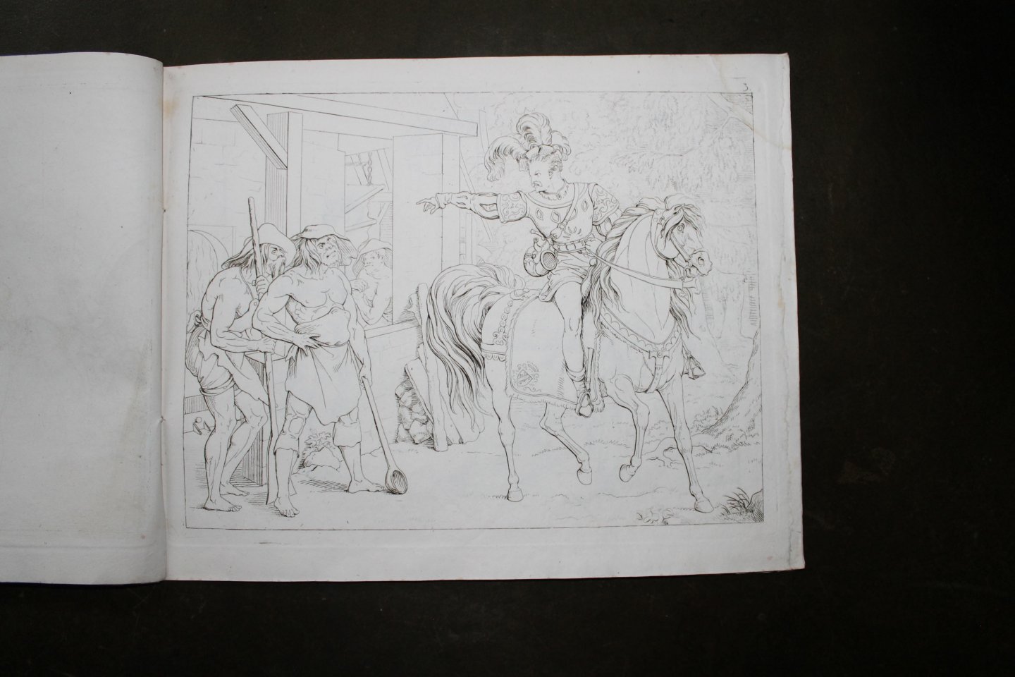 1823, Broschur mit 10S. Text. + 8 Radierungen in Umschlag. Umschlag schmutzig und mit Gebrauchsspuren. Radierungen mit leichten Fleck Ecke rechtsoben. Sonst gut erhalten. Siehe Bilder. Querformat