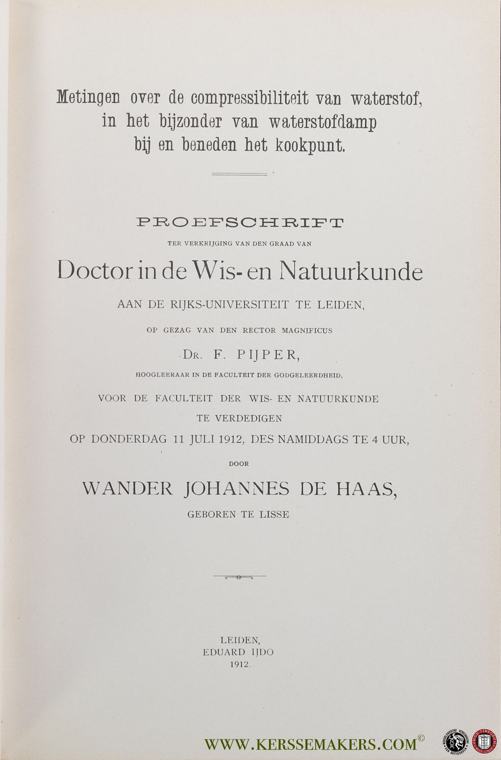 De Compressibiliteit van Waterstofdamp - Metingen over compressabiliteit van waterstof in het bijzonder van waterstofdamp bij en beneden het kookpunt. [ First edition of his thesis. Cooperator of Lorentz, Keesom & Einstein ]