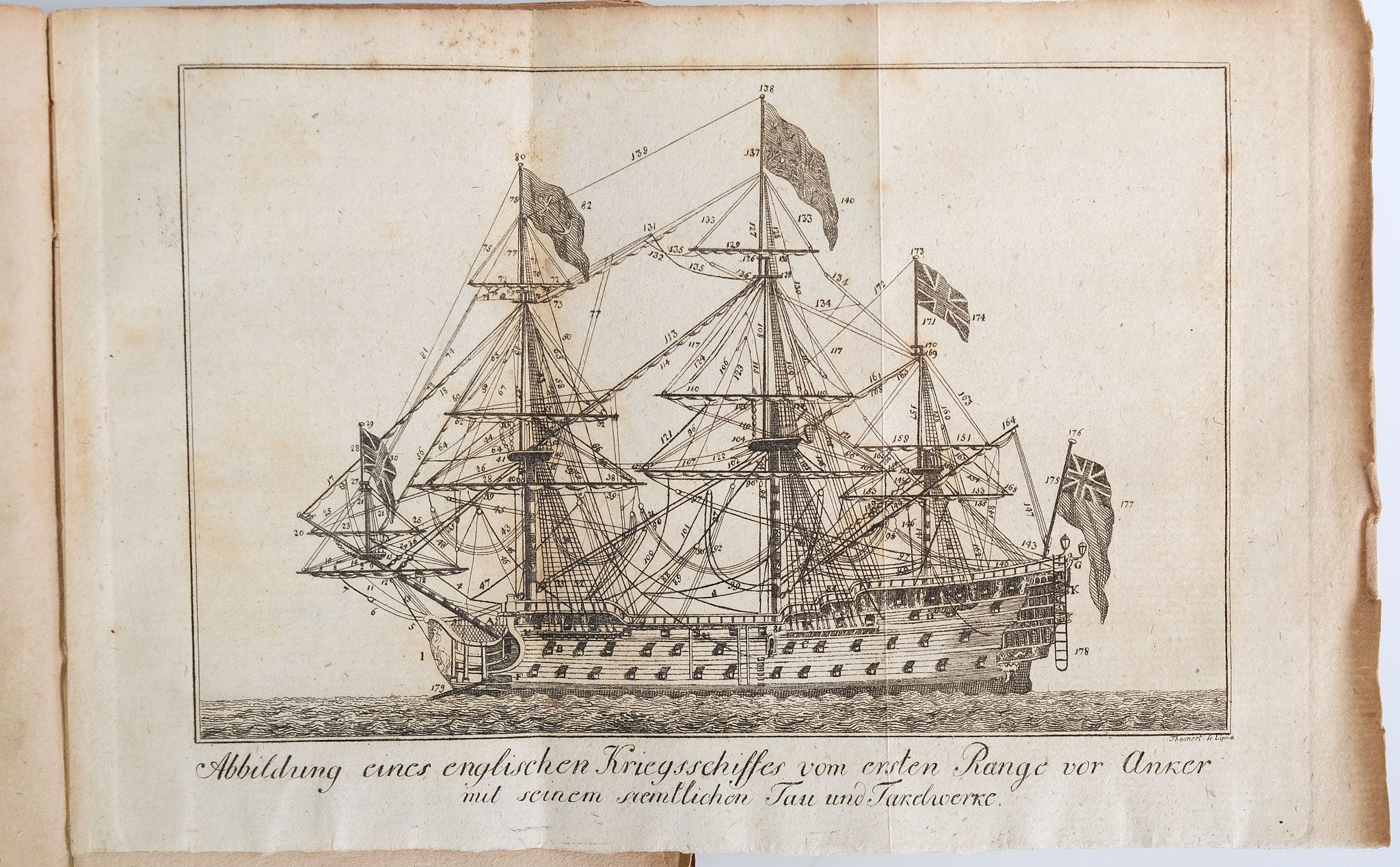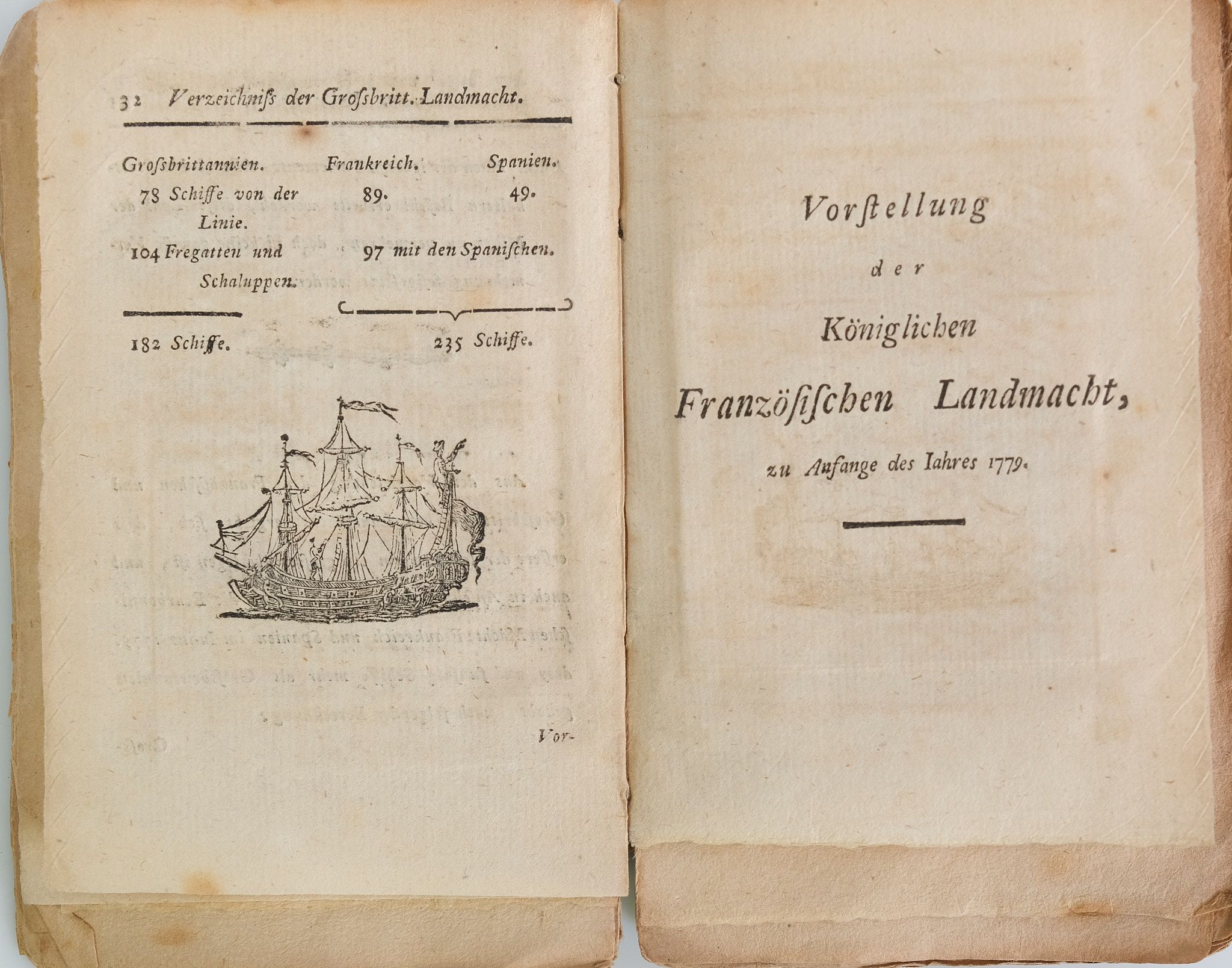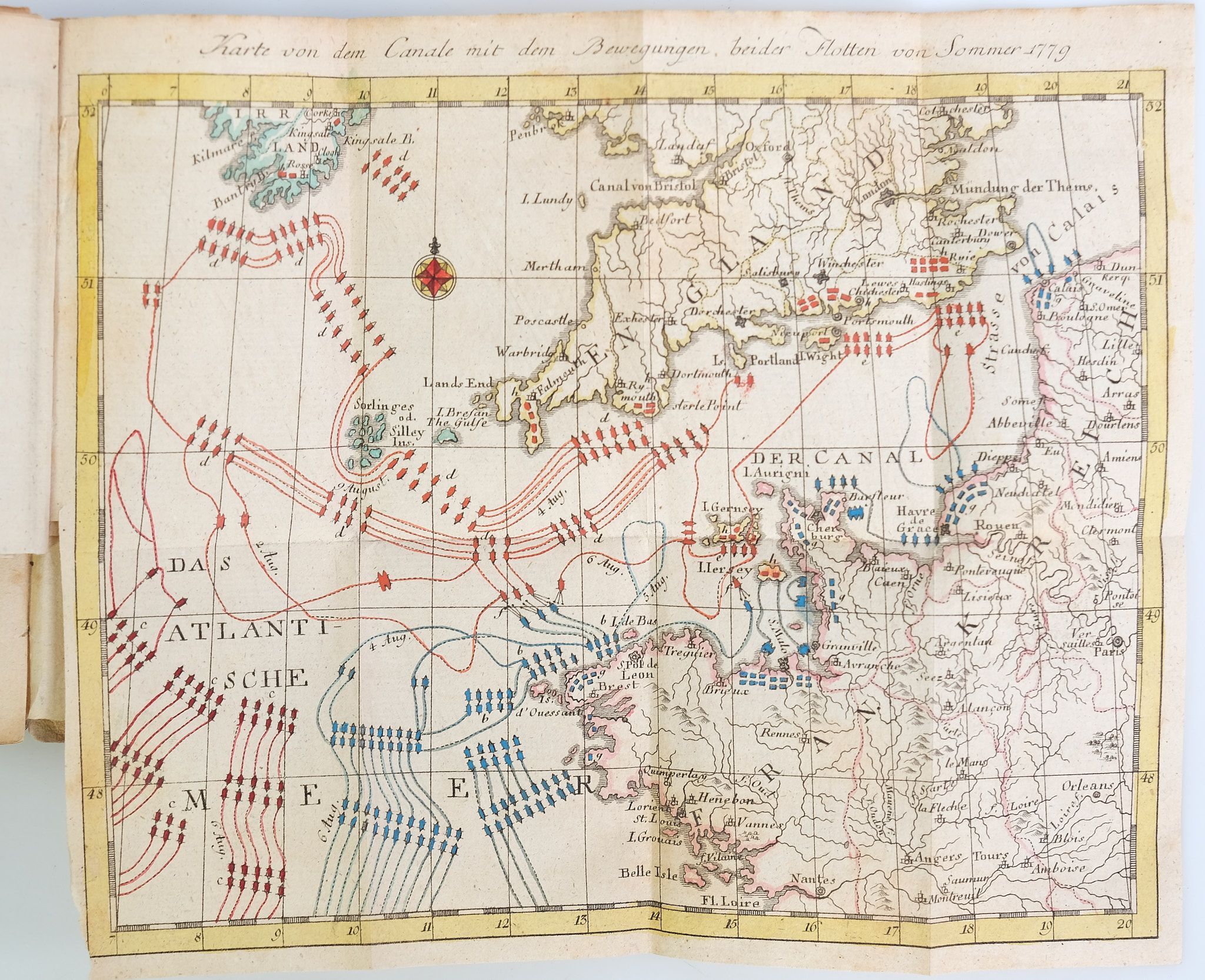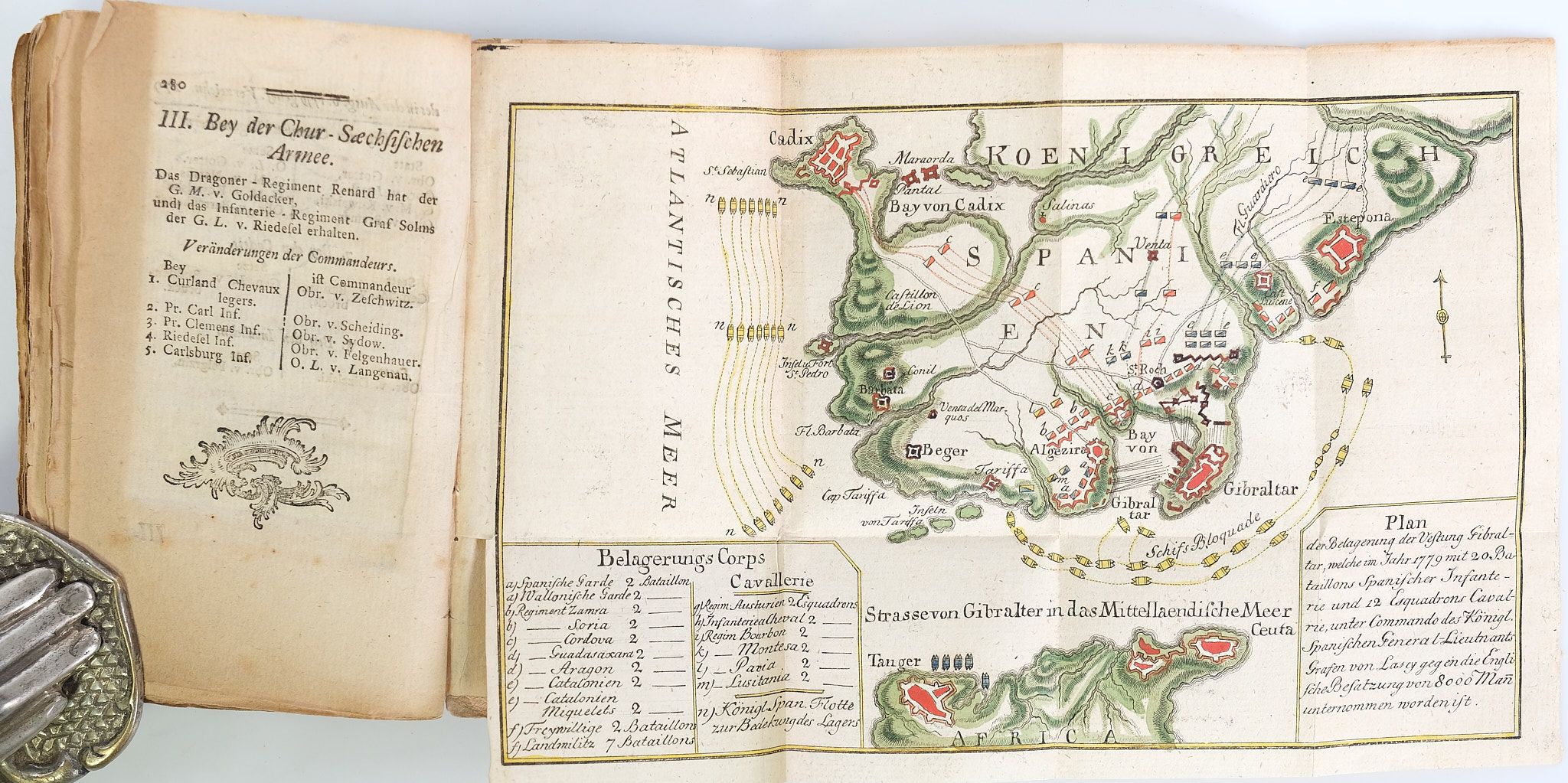 Small 8vo (14x9 cm). Original blind wrappers of decorated paper (some loss of paper, mainly to the spine). Uncut. (iv),280,(ii blank) pp. (paper age-toned and with occasional brown spots). With 1 folding schedule: "Englischen Militz" and 5 engraved plates: 2 handcoloured folding tables: "Plan der Brittischen Armee..." and "Plan der Königlichen Französischen Armee...", 1 folding plate: "Abbildung eines englischen Kriegsschiffes..." (12x18cm), 1 handcoloured folding map engraved by J.G. Schmidt: Charte der Brittischen Laender in Nord-America" (17x21 cm) and 1 handcoloured plan: "Belagerung der Vestung Gibraltar, 1779" (14x22 cm). - 2 leaves (p.207-210) loose, not tied; pages 67-70 wrongly numbered, but complete; outer margin of page 45/46 cut short. - Apart from the remarks made above still an attractive copy with interesting illustrations, descriptive the English colonies, but most of all the equipment (warships, , artillery) of the troops at the beginning of the siege that lasted till 1783.