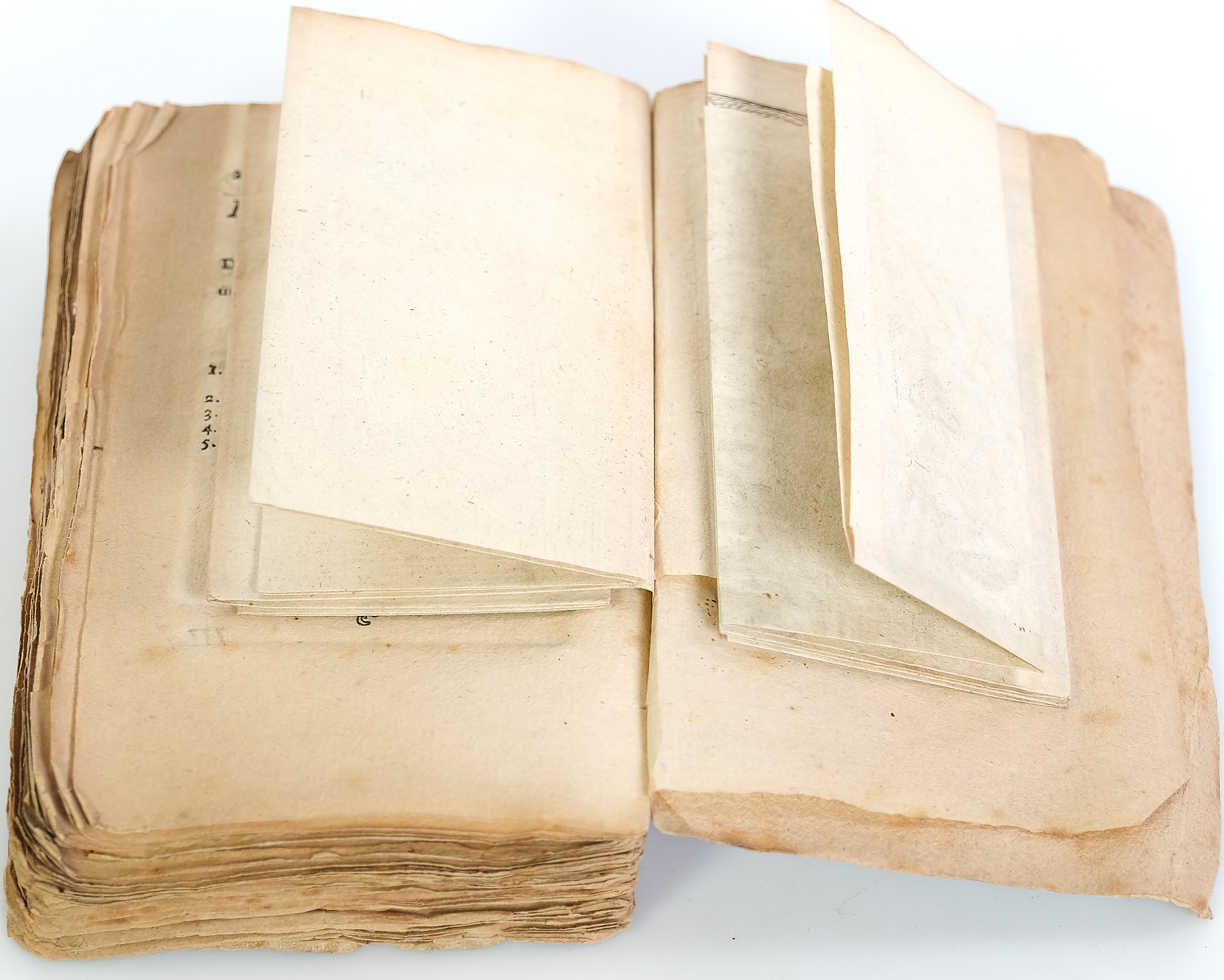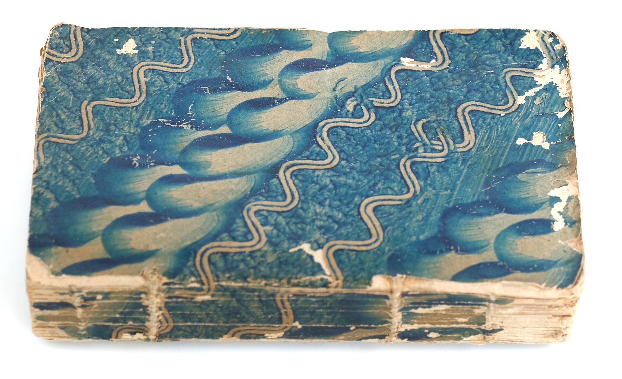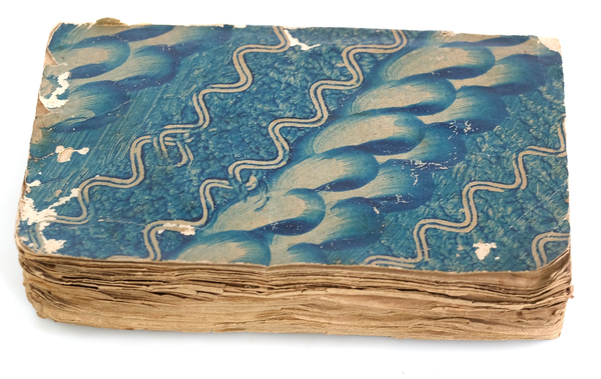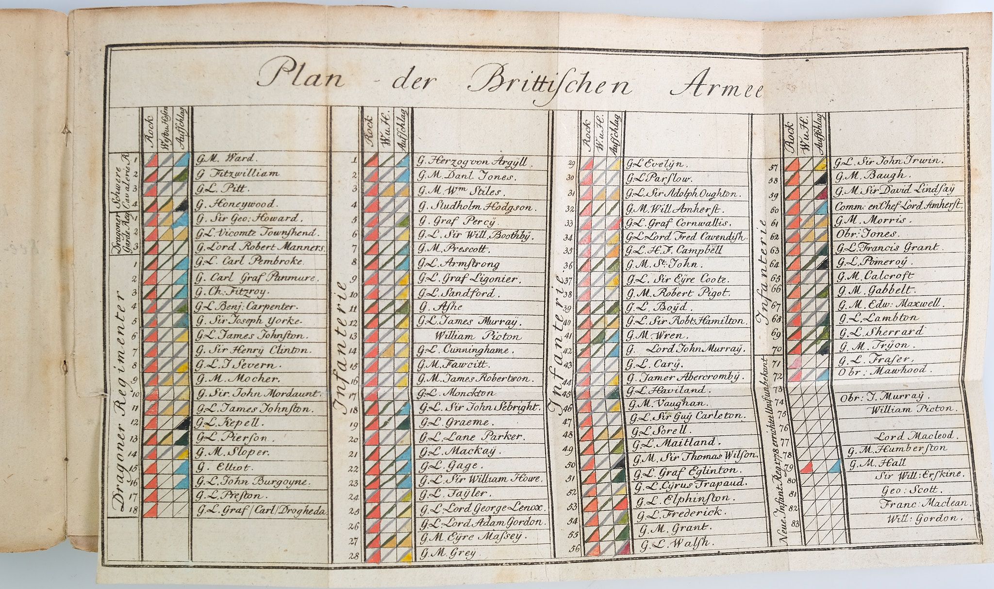 Small 8vo (14x9 cm). Original blind wrappers of decorated paper (some loss of paper, mainly to the spine). Uncut. (iv),280,(ii blank) pp. (paper age-toned and with occasional brown spots). With 1 folding schedule: "Englischen Militz" and 5 engraved plates: 2 handcoloured folding tables: "Plan der Brittischen Armee..." and "Plan der Königlichen Französischen Armee...", 1 folding plate: "Abbildung eines englischen Kriegsschiffes..." (12x18cm), 1 handcoloured folding map engraved by J.G. Schmidt: Charte der Brittischen Laender in Nord-America" (17x21 cm) and 1 handcoloured plan: "Belagerung der Vestung Gibraltar, 1779" (14x22 cm). - 2 leaves (p.207-210) loose, not tied; pages 67-70 wrongly numbered, but complete; outer margin of page 45/46 cut short. - Apart from the remarks made above still an attractive copy with interesting illustrations, descriptive the English colonies, but most of all the equipment (warships, , artillery) of the troops at the beginning of the siege that lasted till 1783.