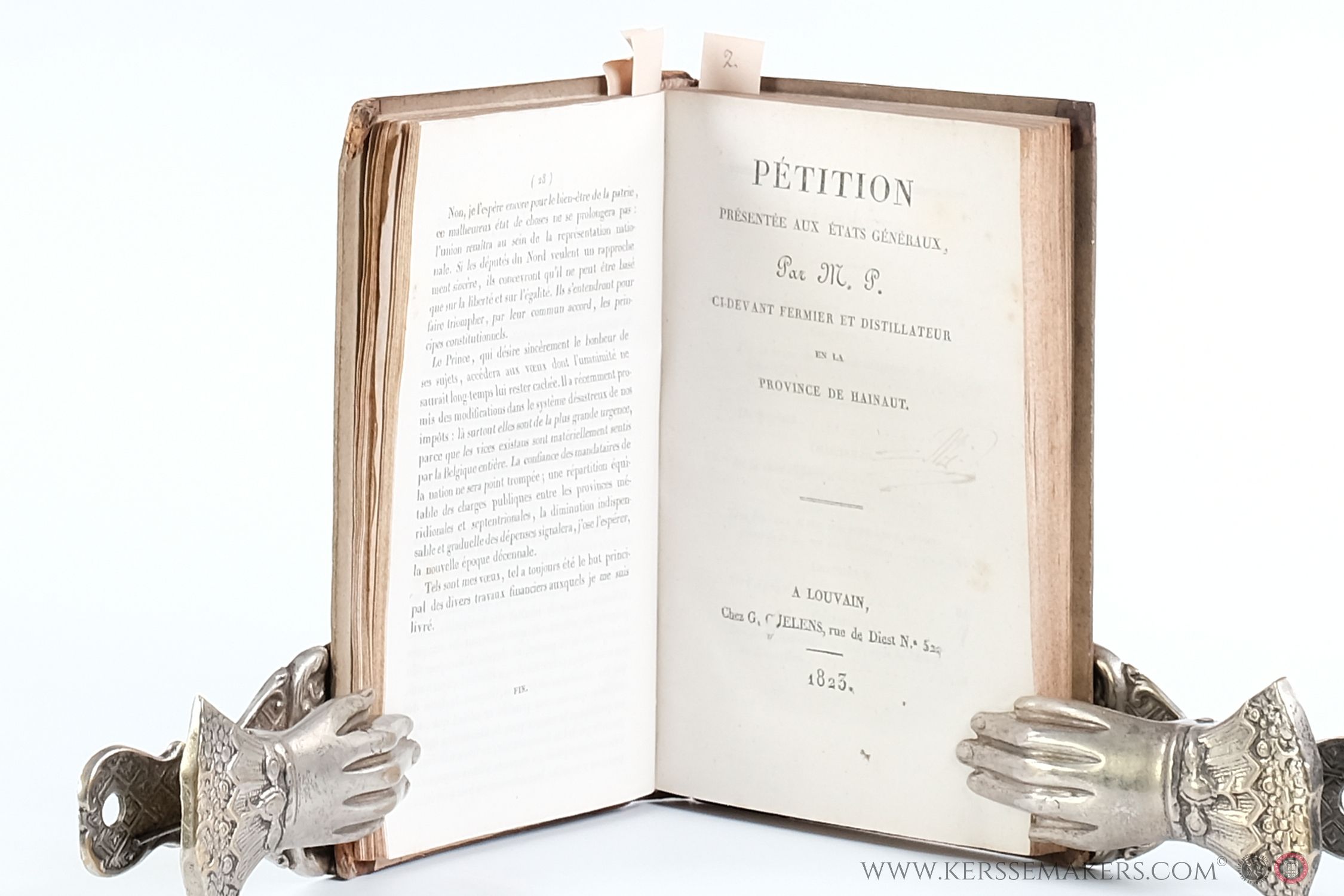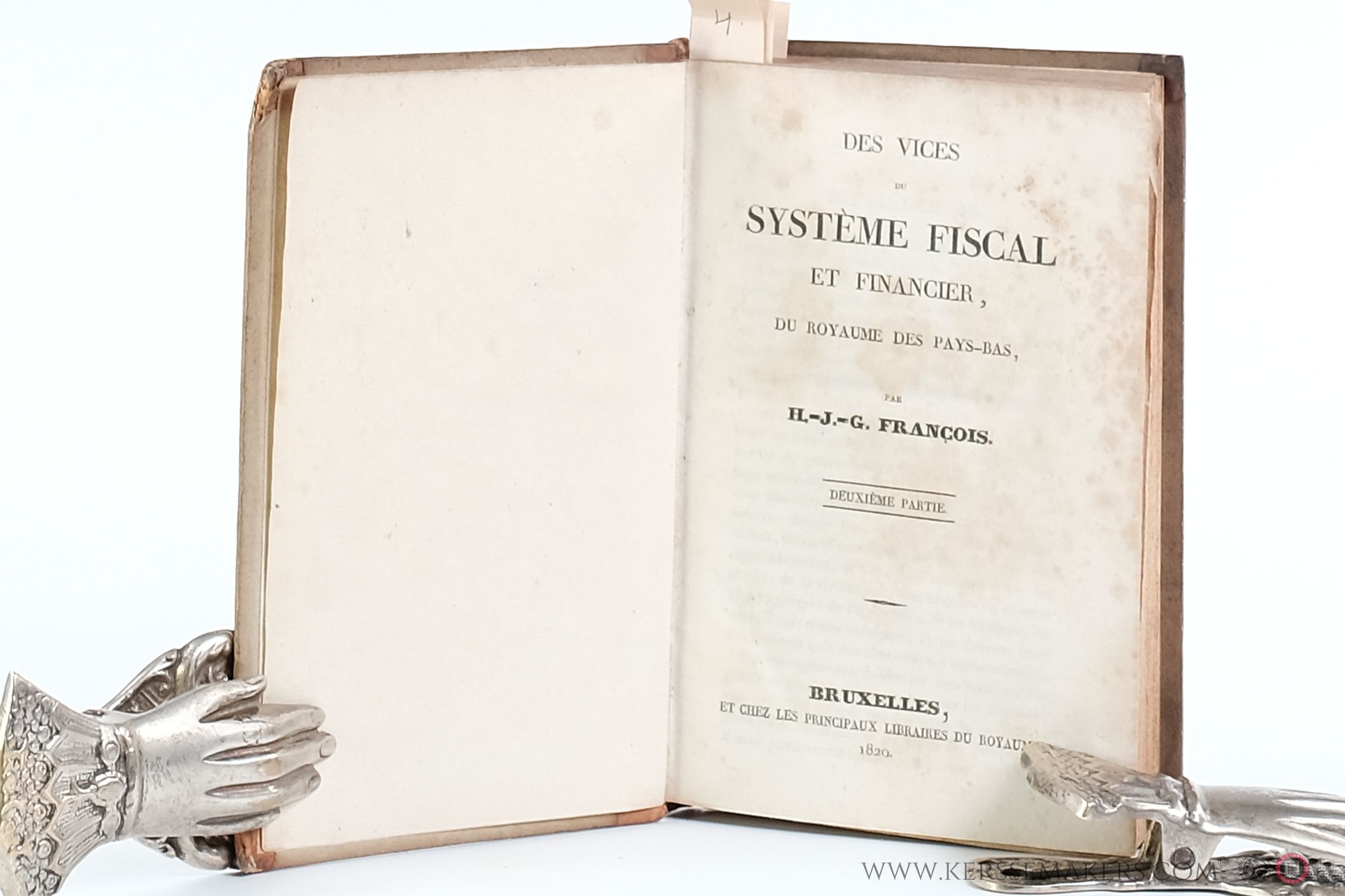 A collection: 1) Pétition présentée aux États Généraux, par M. P. ci-devant fermier et distillateur en la Province de Hainaut. Louvain, 1823. - 2) Observations sur l'ouvrage intitulé: Manuel de l'administrateur du manufacturier et du négociant, ou Tableau statistique de l'industrie des Pays-Bas, de J.-J. De Cloet, par M. P......., cultivateur à .... . Bruxelles, De l'Imprimerie de Pinchon- De Broux, 1824. - 3) Comparaison du produit des impots dans le nord et dans le midi du royaume en réponse à la Gazette des Pays-Bas. Par H.J.G. François. Bruxelles, Chez les Principaux Libraires, 1830. - 4) (Anonym). Rencontre de pensées sur le système 'enquêtes relatives aux impots, dans le royaume des Pays-Bas. N.pl., de l'Imprimerie d'Ed Vanderstraeten, n.d. - 5) Deuxième Partie: Des vices du système fiscal et financier du royaume des Pays-Bas, par H. François. Bruxelles, Chez les Principaux Libraires du Royaume, 1820. - 6) Tableau synoptique figurant la population du royaume des Pays-Bas: Il rapprte les produits des accises par ménage et habitant... .