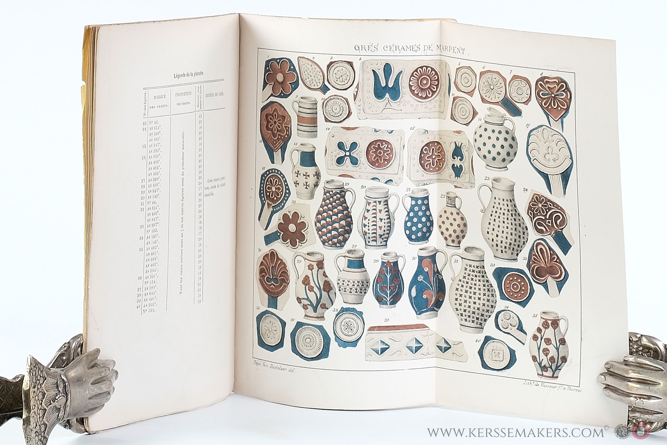 8vo (24x16 cm). Orig. printed wrappers (2 small holes in frontcover). 24, (ii: ""Légende de la Planche"), (ii: Table) pp. Uncut. With folding chromolithography, 19,5 x 22 cm, in vivid colours, depicting 40 pieces of pottery. Lithography by Vasseur (Tournai) after Van Bastelaer. - Good copy