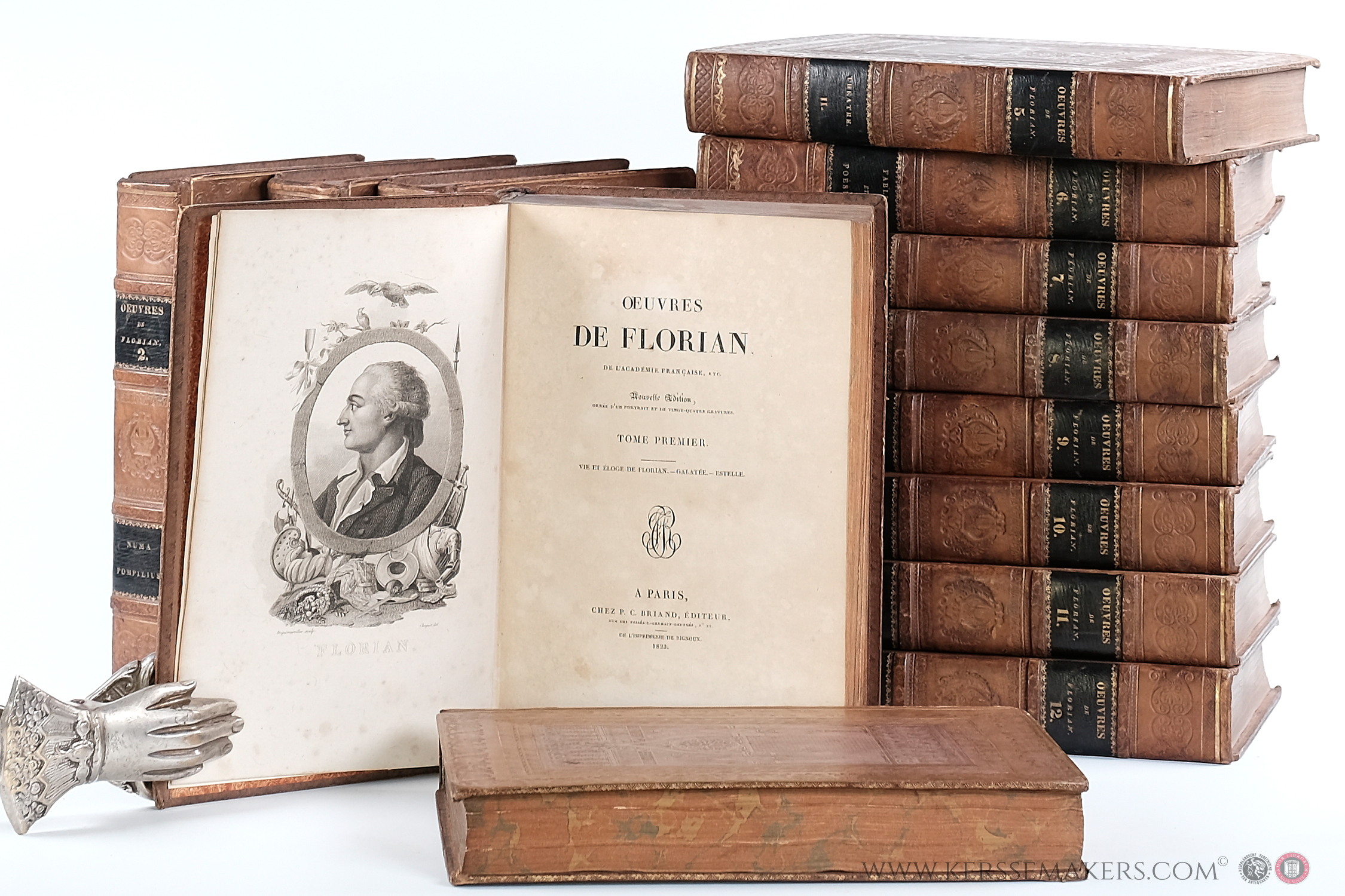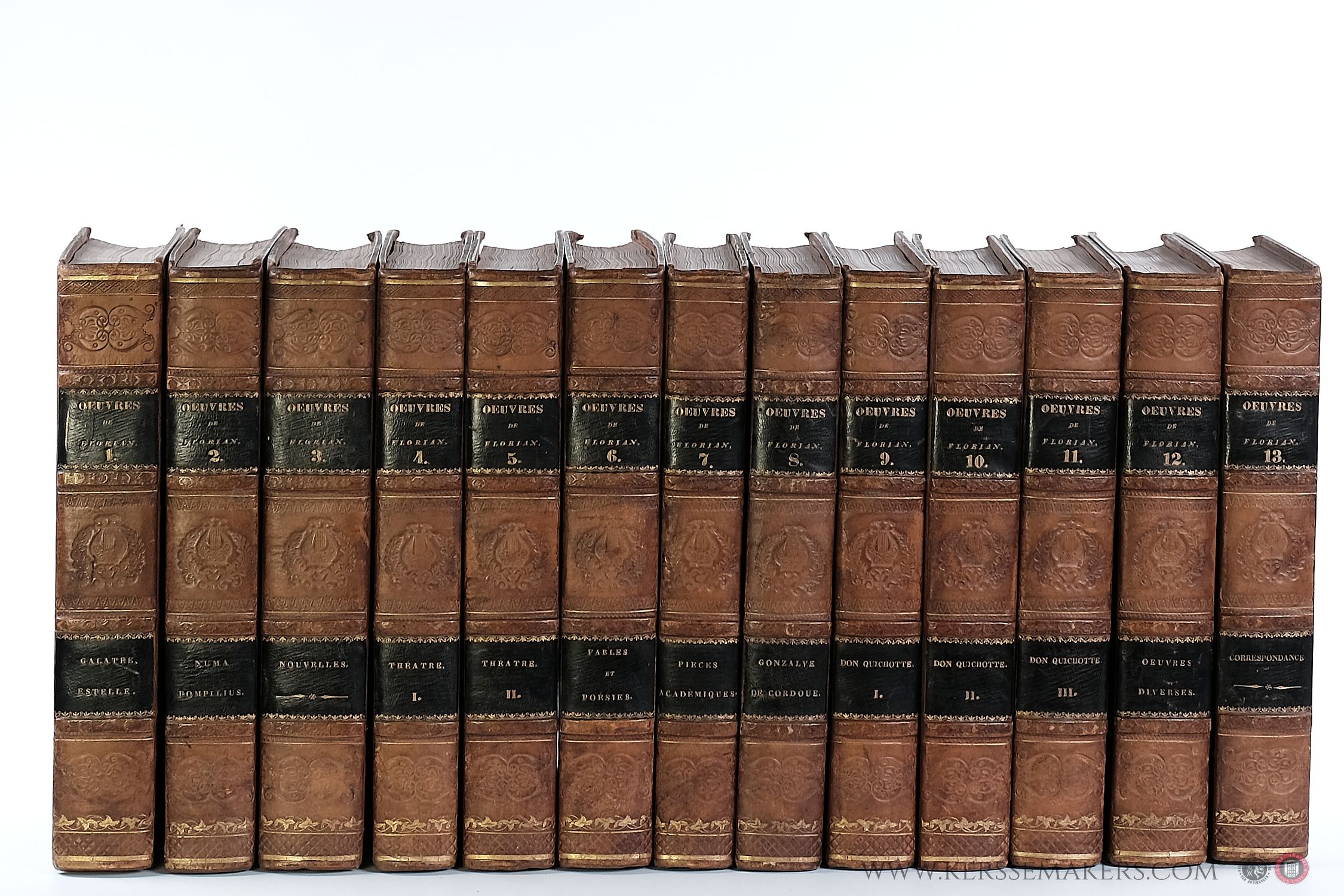 Tome Premier: Vie et éloge de Florian, Galatée, Estelle. (iv),iv,435,(i:blank) pp. with frontispiece. - Tome Second: Numa Pompilius. (iv),408 pp. - Tome troisième: Nouvelles. (iv),459,(i:blank) pp. - Tome quatrième: Théâtre. (iv),368 pp. - Tome cinquième: Théâtre. (iv),246,(i: Avis au relieur),(i:blank) pp. - Tome Sixième: Fables, Contes en vers, Poésies diverses. (iv),400 pp. - Tome Septième: Pièces académiques. Précis historique sur les Maures d'Espagne. xxiv,318,(i: Avis au relieur),(i:blank) pp. - Tome Huitième: Gonzalve de Cordoue. (iv),396 pp. - Tome Neuvième, Dixième, Onzième Nouvelle série 1-3): Don Quichotte de la Manche. (iv),376; (iv),384; (iv),387,(i:blank) pp. - Tome Douzième (4): Jeunesse de Florian, Guillaume Tell, Éliézer, Mélanges.. (iv),435,(i:blank) pp. - Tome Treizième (5): Oeuvres diverses, Correspondance. viii,416 pp. & facs. (double-page).