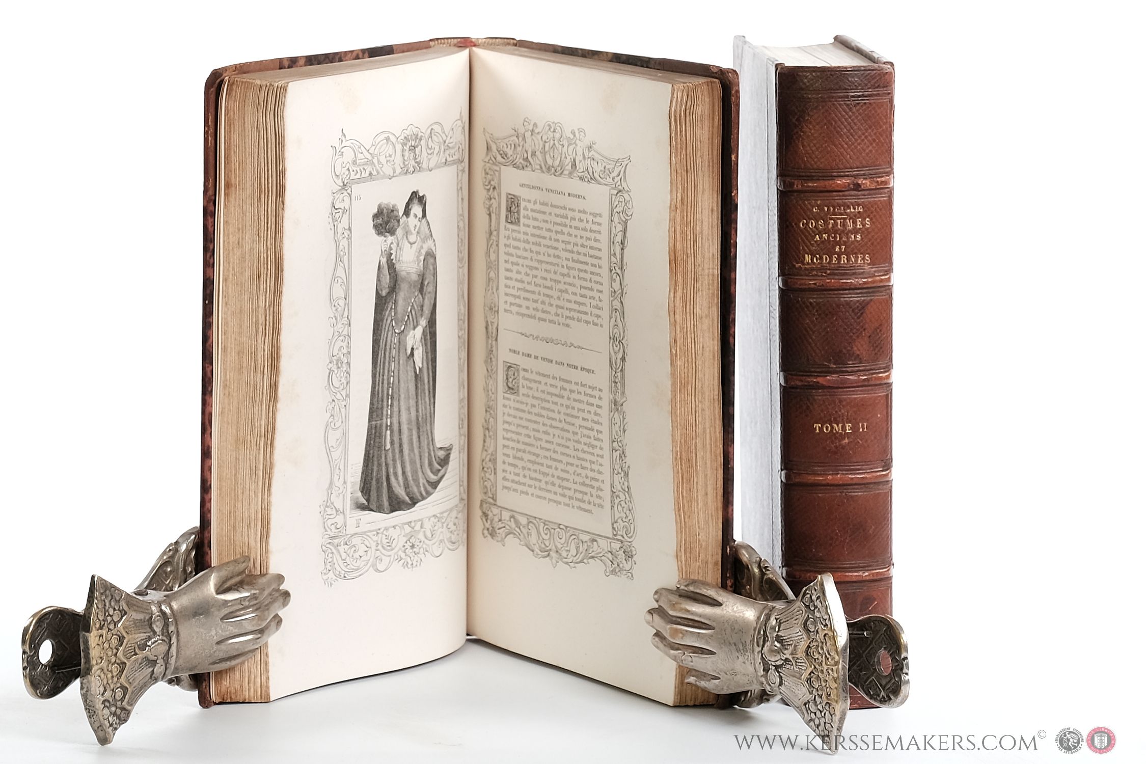 2 vols. 8vo (23x15 cm). Contemporary halfleather, with cornerpieces. Spines with ribbons, gilt title on spines; top edges gilt, uncut. Marbled endpapers. (Superficial tears in hinges; corners sl. bumped; ribbons dented). Tome I: (iv) pp., p. 5-9, (i:blank) p. 234 leaves, 18 pp. (P.5-9: Amb. F. Didot, Avis sur la IVe édition du Recueil). Tome II: (iv)pp., leaves 235-513, 19 pp. - 2 engraved titles and 513 engraved plates by Huyot, with explanatory text in French and Italian opposite. The plates are reproduced from the 3 editions by Vecellio: 1590, 1598 and 1664. All the plates and texts have different decorative ornamental borders in woodcut: flower ornaments and architectural ornaments. The 18 and resp. 19 pages at the end: "Tables des Matières". - Some brown spots, mainly in the first quires of each volume, but a good set.