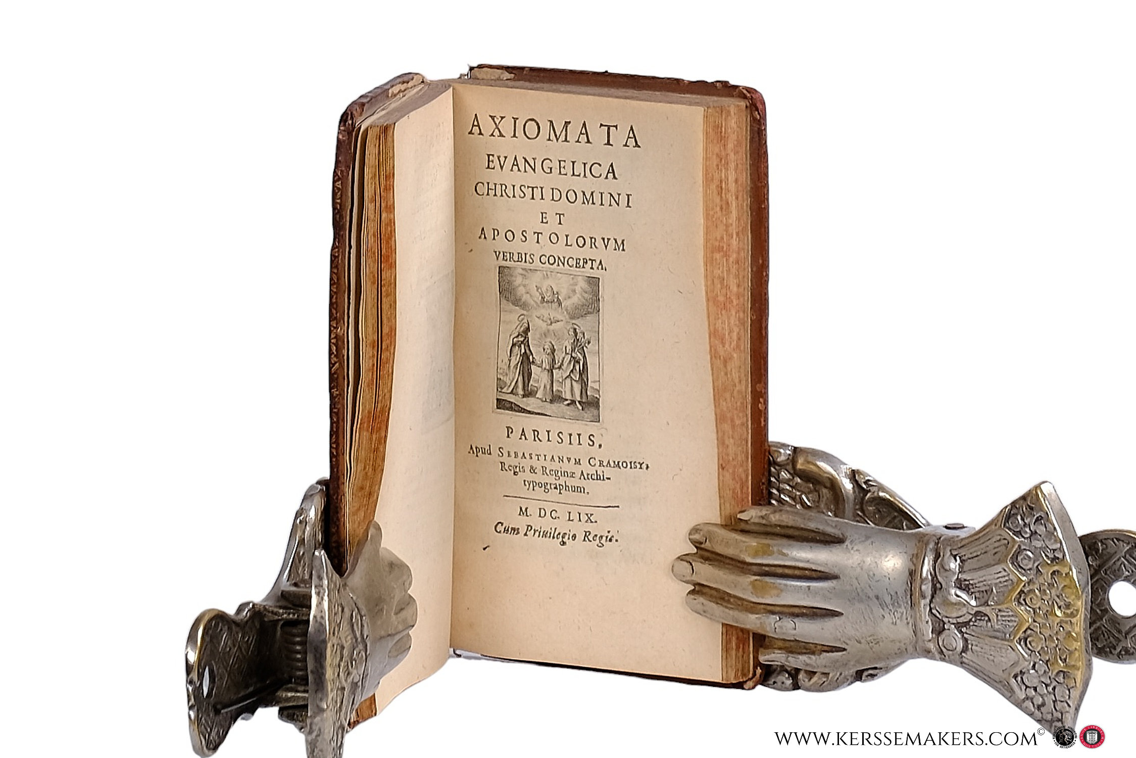 2 titles but 1 work in contemporary leather binding. Spine gilt in compartments (top and foot spine and corners damaged with loss of leather). viii,77,(i) pp. and (iv),128,(xviii: 'Index Davidis exe(r)pta' & 'Index Axiomata) pp. With 2 engraved title-vignettes (repeated) and 1 (of 2) frontispieces. - First editions . The 2 titles together forming the complete text of 232 pages. - See: Bibliothèque Mazarine owing the same combination. - With a cupper-engraved exlibris of Sanson and a later one of G. Desjardins. - 1 frontispiece missing. - Very rare.