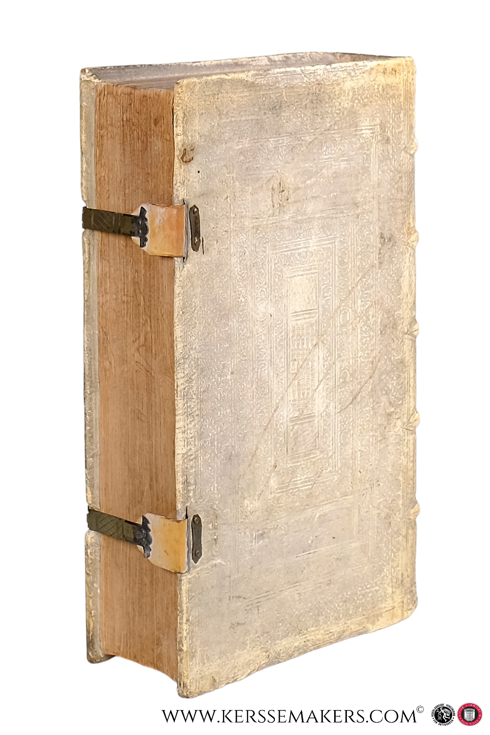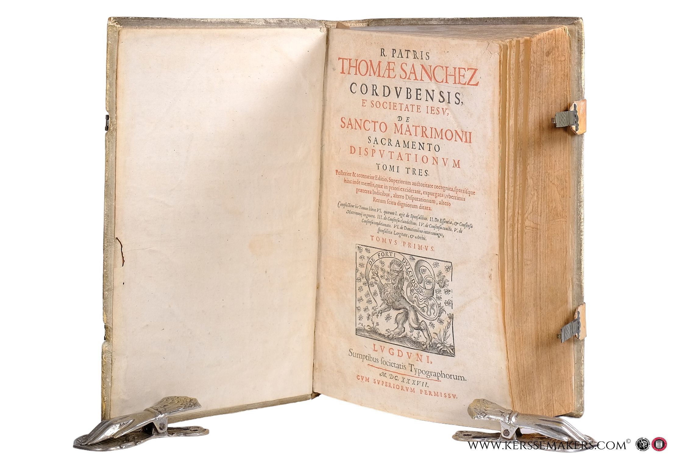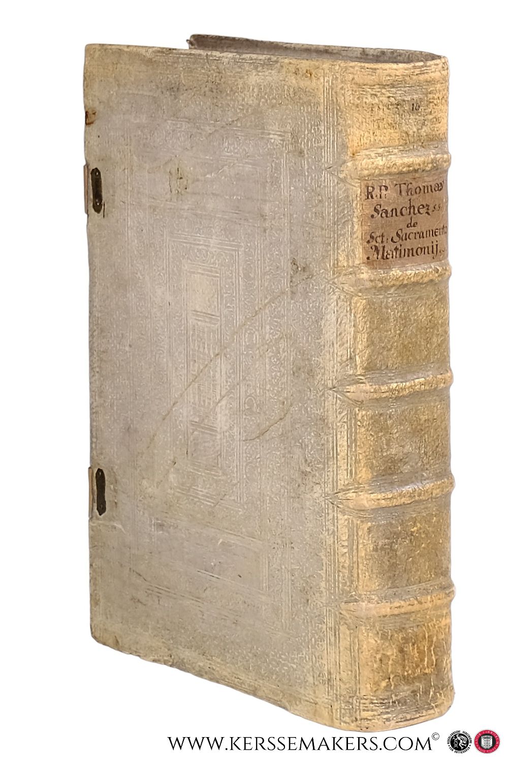 3 vols. in 1 binding. Folio (37x24 cm). Contemporary pigskin over wooden boards. Spine with ribbons; covers blindstamped with centerpiece (small hole in frontcover, minimal wormholin); with 2 brass clasps with (renewed) leather locking plate. - Tomus Primus: 520 pp.: (ii) title printed in red and black, with woodcut vignette, (iv) Elogia & Approbatio, (xiv) Index, 500 text. - Tomus Secundus: 404 pp.: 1 & 2: Title and Approbatio, 3 & 4 Elogia & Proemium, 5-404 text. - Tomus Tertius: 472 pp.: 408 pp. incl. title, 58 pp. Index Rerum, 4 pp. Index Locorum iure Concilio Tridentino, 2 pp. blank. - Underlinings with pencil, some with blue colour-pencil in Disputatio VII,XXVII and IX,XXI; some quires browned; light brown spots in places; small tear in lower margin of 18 leaves. - Unfortunately the binder has forgotten to put in 1 quire: Six leaves between Disputatio LXIII-LXVXIX of Liber VII missing. - Sanchez'most important work, carefully printed in 2 columns, Claudii Larjot,Ioannis Iullieron, Irenaei Barlet, & Scipionis Iasserme. - Good, wellbound copy, but 1 quire (see above) missing.