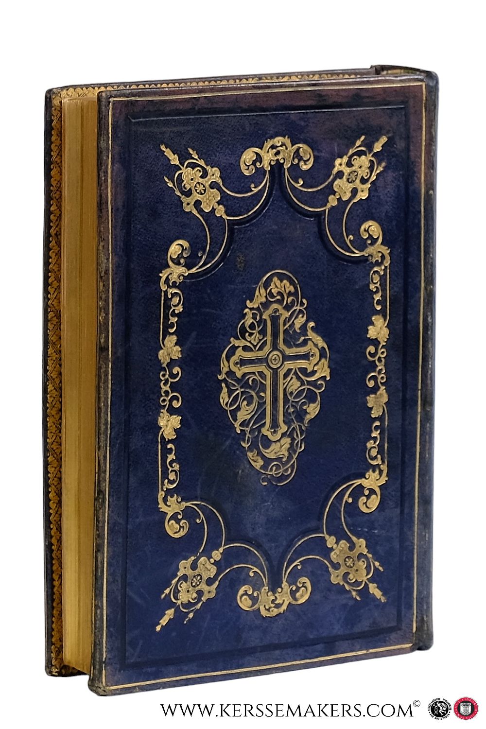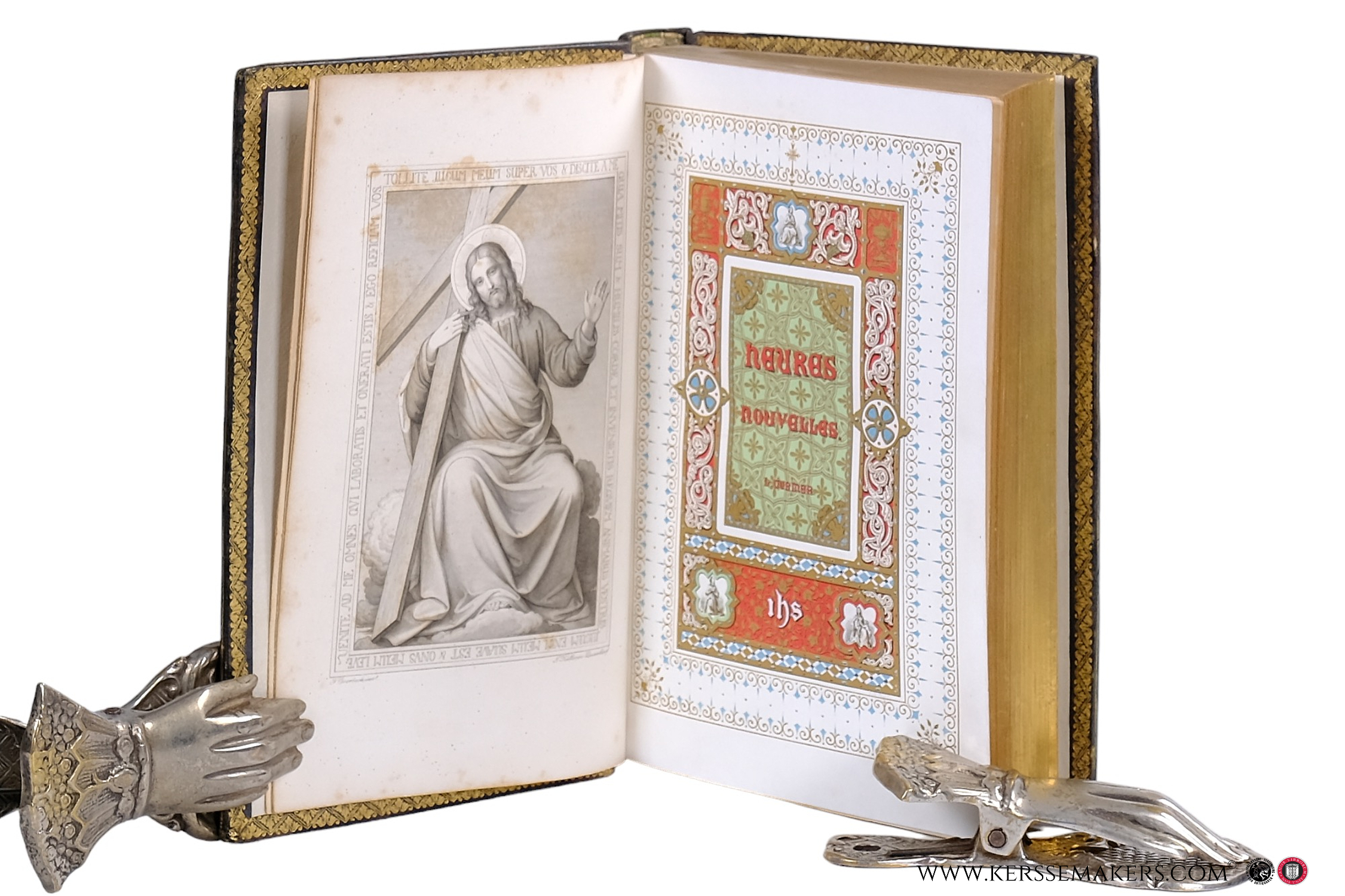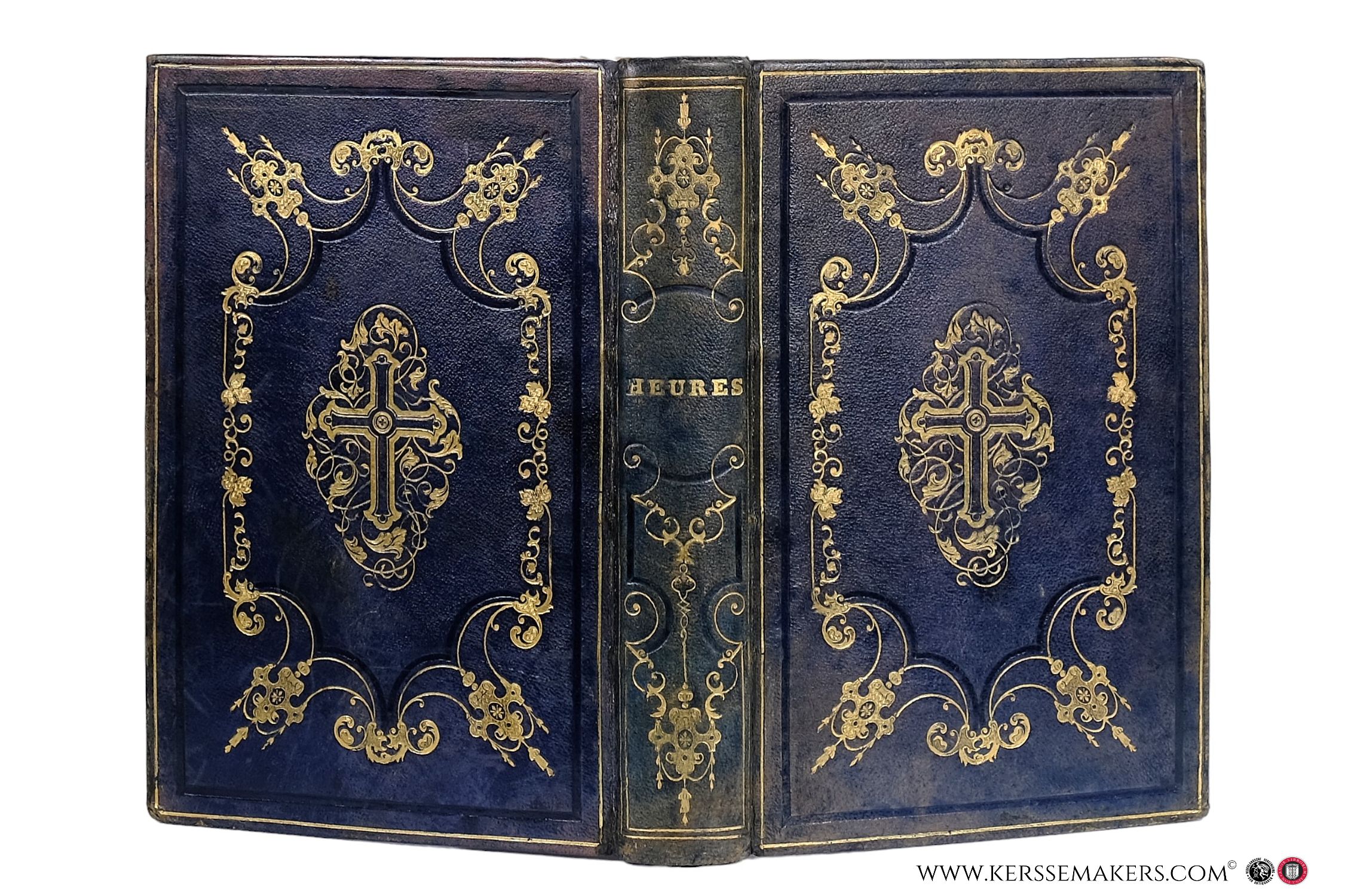 Large 8vo (23x16 cm). Contemporary darkgreen calf, covers and spine richly gilt with ornamental gilt decoration with a cross as centerpieces in romantic style. Endpapers with lacework tooling decoration and inside dentelle. Edges gilt. 91 corner sl. bumped). Together 846 pp. with engraved frontispiece, 2 titles: "Les Heures" & "La Messe" lithographed in vivid colours and metallic gold ink on art paper and 11 other engravings. Printed on 'papier de Chine', but the plates on normal paper and therefore with more or less serious brown spots. With ornamental capitals and many pages in illuminated frames in early photo-engraving. - Collation: ii (halftitle), ii (title), viii (Préface), xvi (Calendrier), xvi (Souvenirs de famille), 8oo, i (Classement des gravures), iii (blank) pp. - Nice example of 19th century typography and romantic bookbinding. "Reliure aux ornaments de style rocaille".