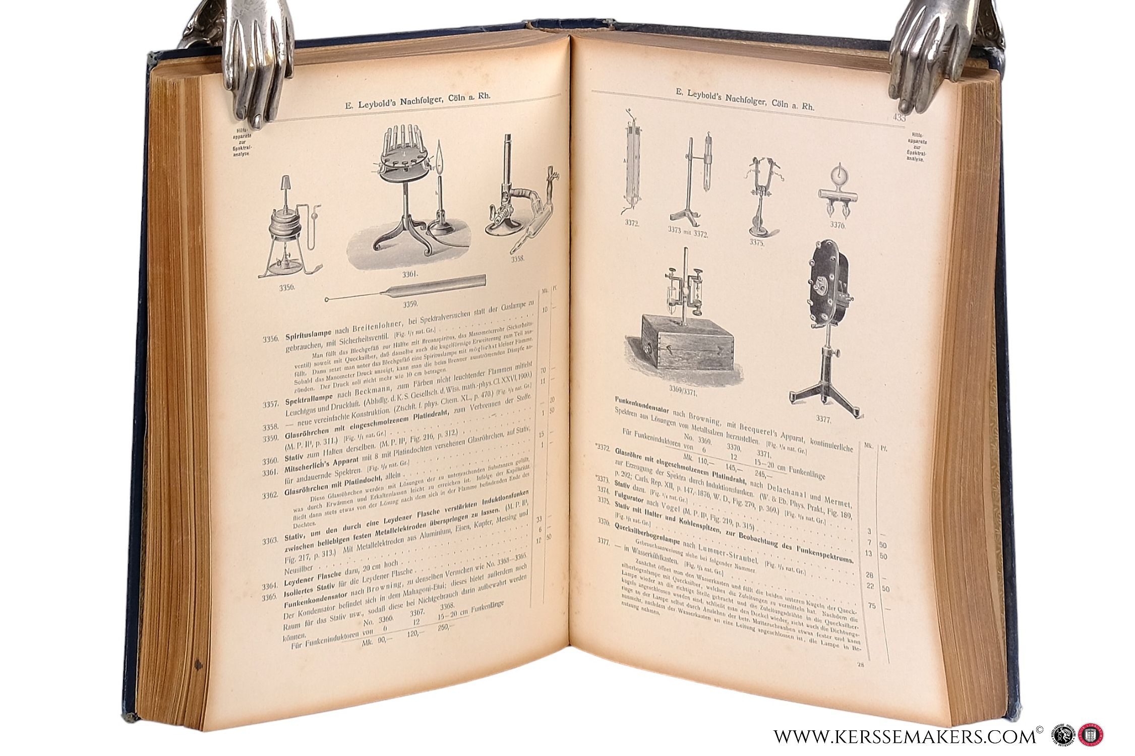 Small folio (31x23 cm). Blue publisher's cloth with title on frontcover and spine printed in white (corners a bit damaged; tear in 1 hinge); decorated endpapers. viii,902, (ii:blank) pp. With descriptions of 8.928 apparatus with more than 8.932 numbered illustations! (also with A or B numbers) "Eine Úbersicht úber die Hülfsmittel, die für den naturwissenschaftlichen Unterricht zur Verfügung stehen. Inhalt: Einleitung (Geschichte, Literaturverzeichnis), Allgemeine Einrichtung der Unterrichtsräume (1-30), Mechanik (31-165), Wellenlehre (166-174), Akustik (167-216), Wärme (217-300), Optik (301-525), Magnetismus (526-528), Elektrizität (526-804), Apparate für Schulübungen usw., Mikroskopische Präparate, Register und Errata". - Outer margins sl. browned, but a nice, spotless copy. - In a strong binding with only a few imperfections.
