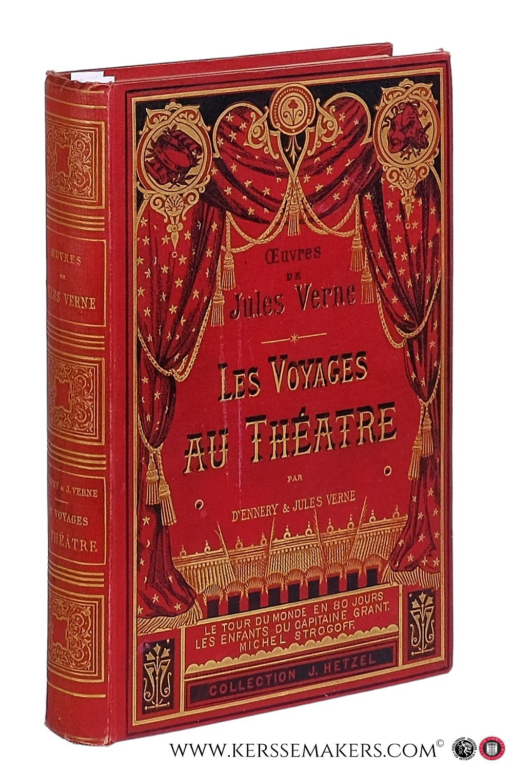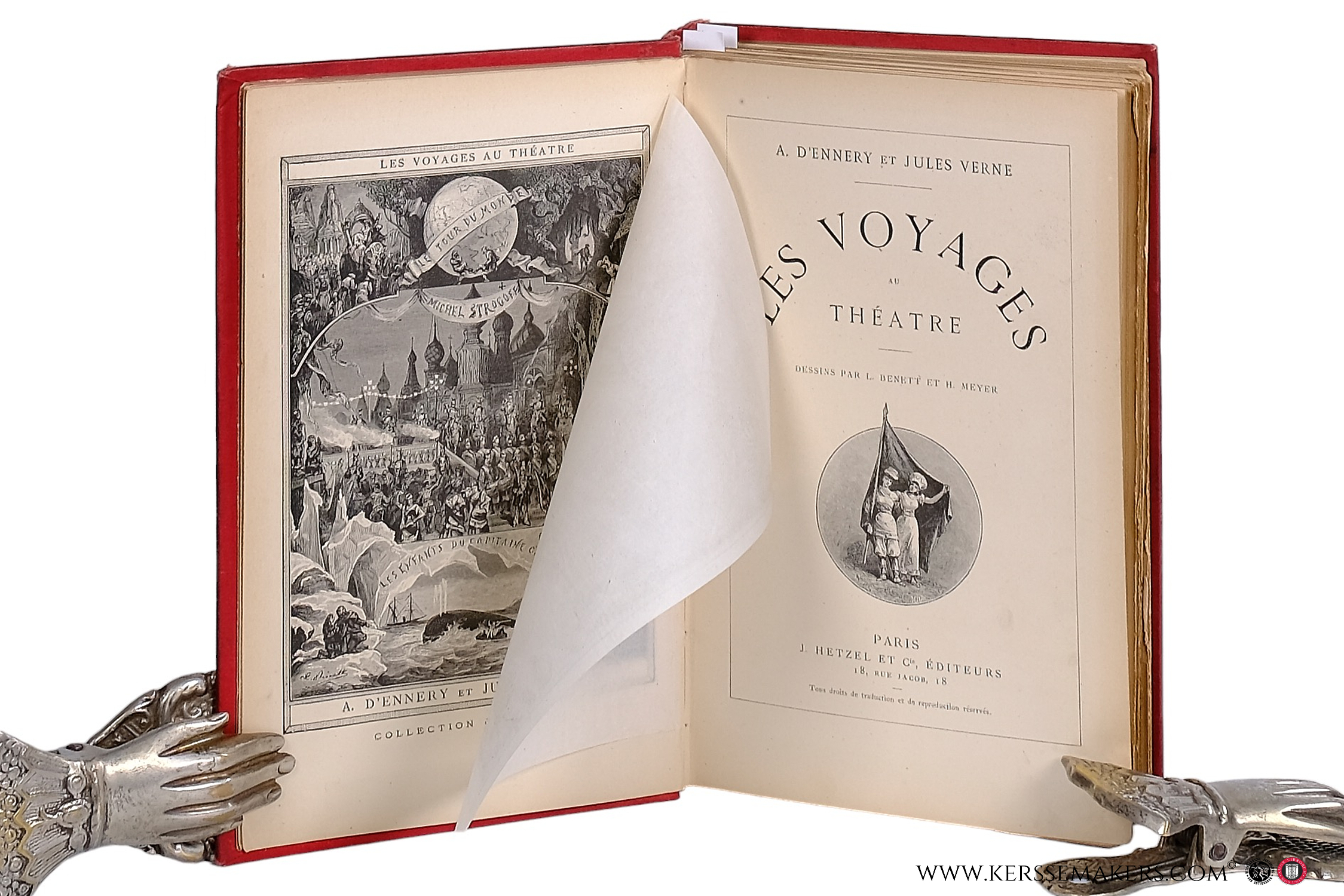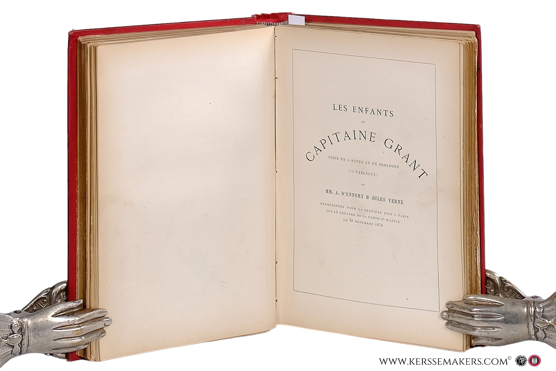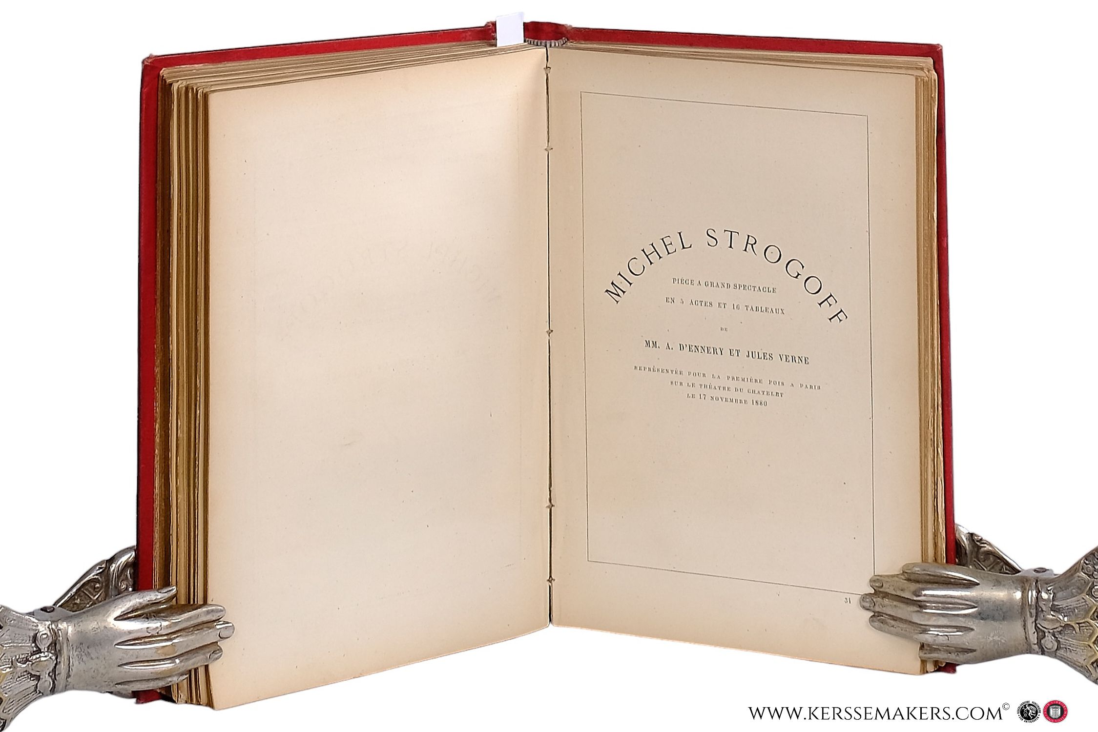 8vo (24,5 x 16,5 cm). Original red publisher's cloth, frontcover and spine gilt, backcover stamped in black. Frontcover illustrated "au rideau de théâtre du premier type". Edges gilt. Unfortunately irregular bookblock with pages loosening (caused by the plates on stiff paper). General halftitle, frontispiece and general title with vignette; subtitle indicating the 3 pieces; "Le tour.." p.1-144; "Les enfants.." p.145-264; "Michel Strogoff" p.265-376; "Table" p. 377-78; blank pages 2; Catalogue AQ 1881 ('en préparation pour l'année 1882...') 8 pp. With together 68 illustrations, including title-vignette and 1 frontisp. and 14 plates on stiff paper. - Paper age-toned, but spotless copy in the publisher's binding in vivid colours and in good condition (only foot spine sl. dam). of the first edition