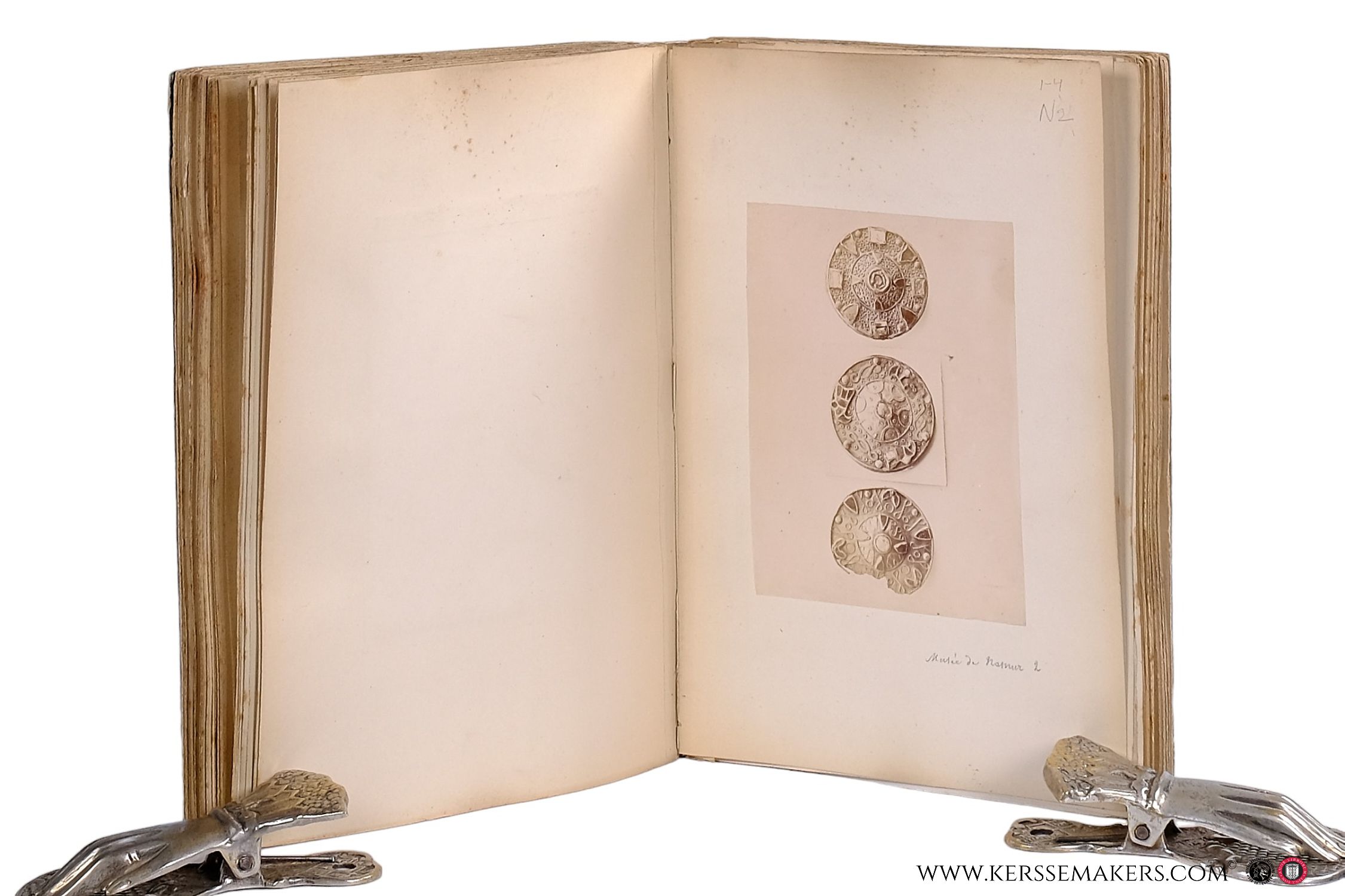 Large 8vo (27x19 cm). Original printed wrappers (soiled; spine loosening and some imperf.), uncut. 166, (iv) pp. (brown spots in places). - Extra illustrated copy: the tabel mentions 27 images: 11 plates and 16 photographs. Our copy with 33 photographs (11 in colours) pasted in on cardboard and 17 engraved plates (10 in colours). The owner added the images with written letterpresses and made underlinings in pencil in text. Photographs and plates of ornements (4, Musée de Namur), numerous relic shrines (Visé, Dinant, Stavelot, Maestricht, Huy),and lacework, 2 laceworkers of Arras and several pieces of liturgical applied art. - The many sheets of cardboard with the mounted photographs cause deformation of the spine but still an acceptable and unique copy