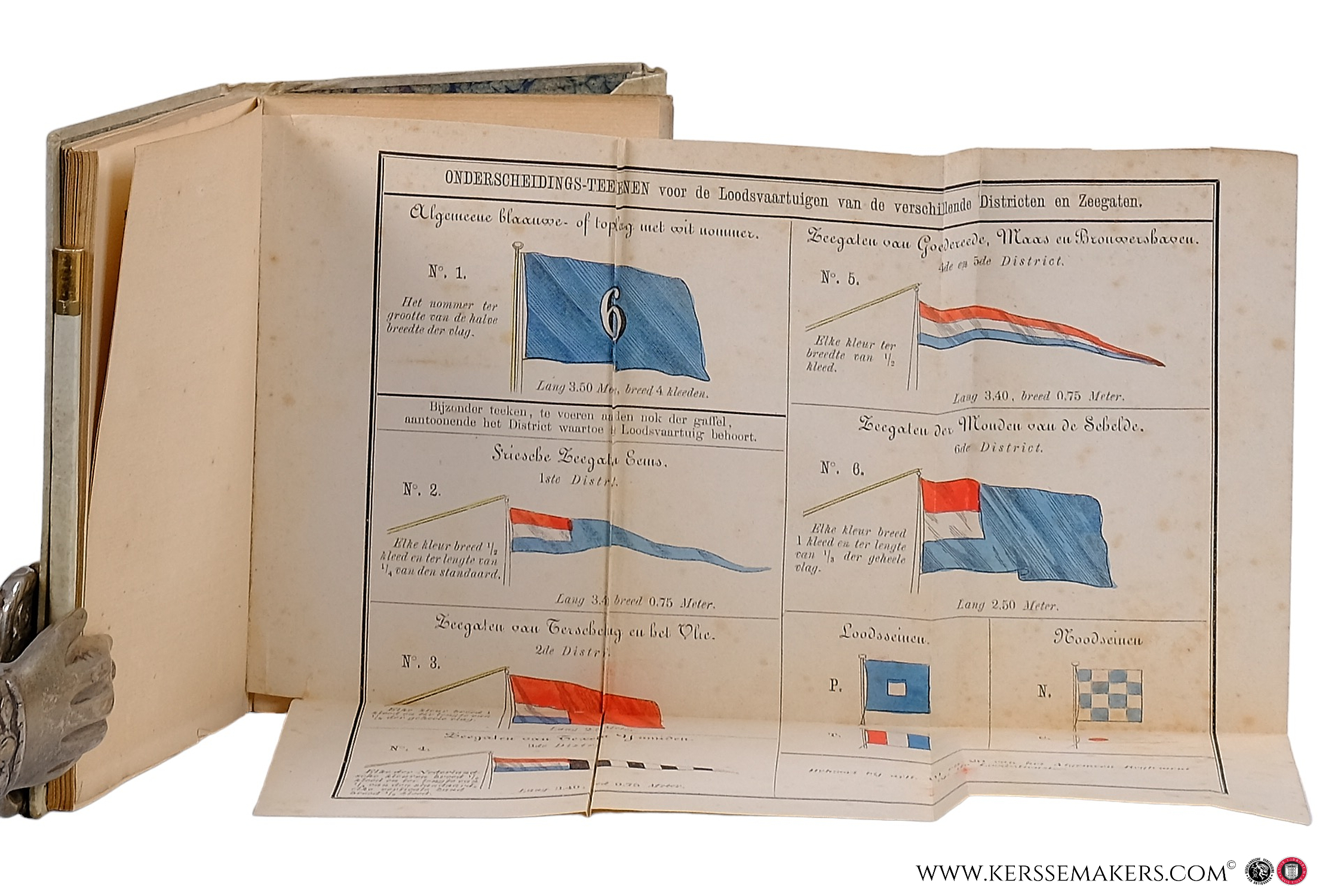 2 parts in 1 vol. Small 8vo (16x10 cm). Contemporary overlapping vellum; marbled endpapers. With the original small pencil in cylinder case of vellum. 82 and 18 pp. with 'Modellen' , 'Certificaten ' & 'Tarieven' in text and folding plate (22x22 cm) with 10 (in 8 sections) "Onderscheidings-teekenen voor de Loodsvaartuigen van de verschillende Districten en Zeegaten": flags and standards coloured by hand. - Spots on vellum, a few inkspots and some annotations in text and on last fly-leaf, but on the whole an attractive copy of a handy utensil in pocket size. Extremely rare edition of "Wet van 1859 na de wijzigingen van 1875 en Februarij 1879".