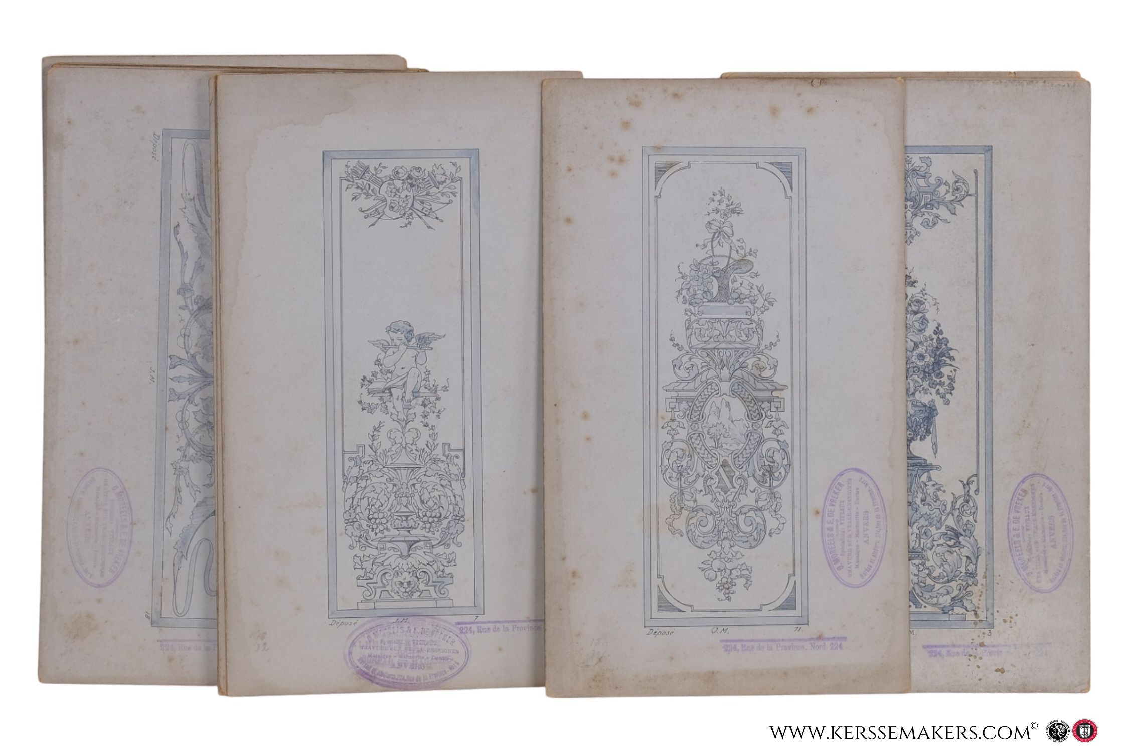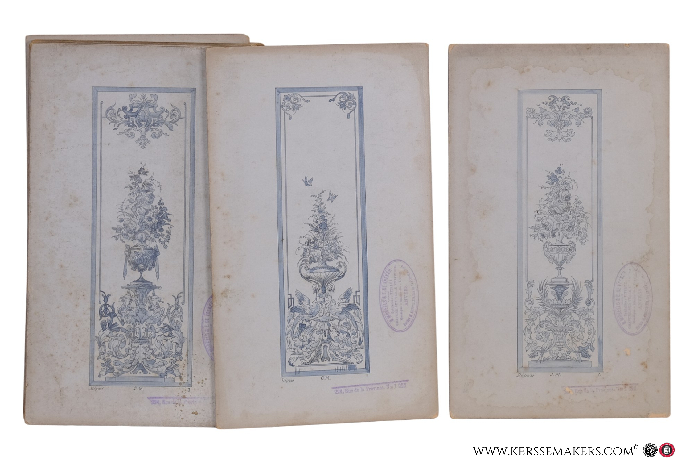 19 (of 30) cardboards. Large 8vo (28x16,5 cm). Dimensions of the plates c. 22x8 cm. Grey cardboard (marginal waterstained; sl. soiled). Present Numbers: 1-4, 7, 11, 16-23, 25-29. Pictorial etched windows and door-panels in different styles, i.a. art nouveau (14)