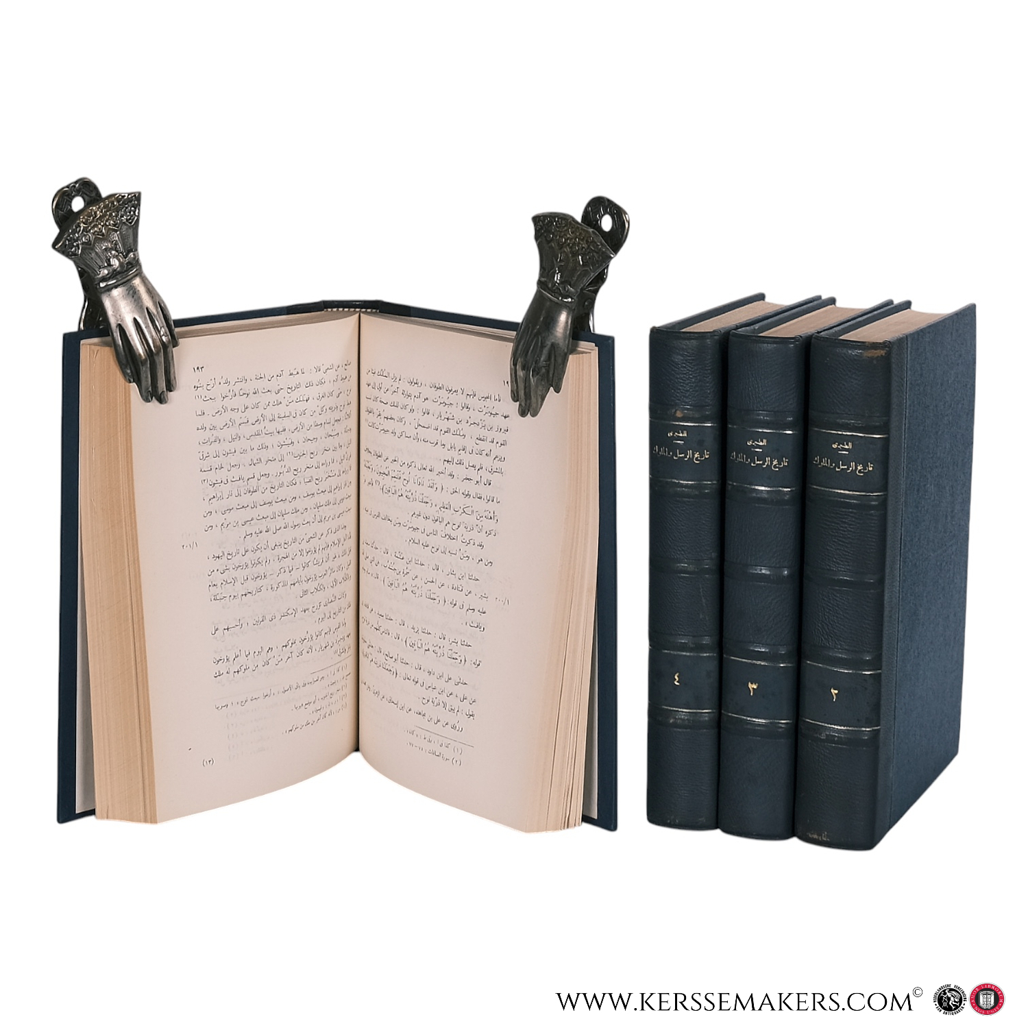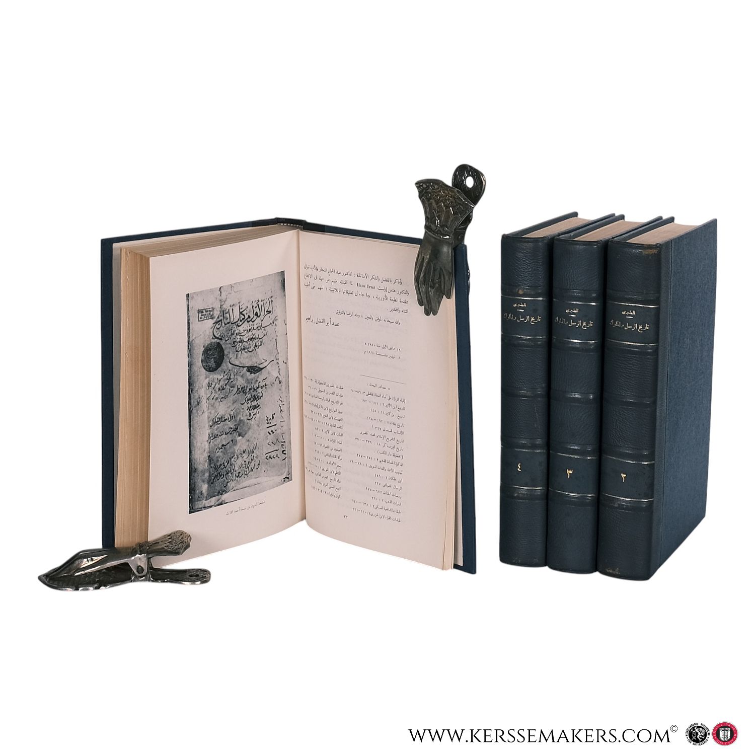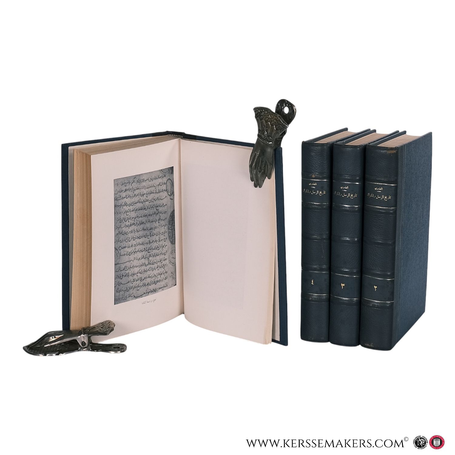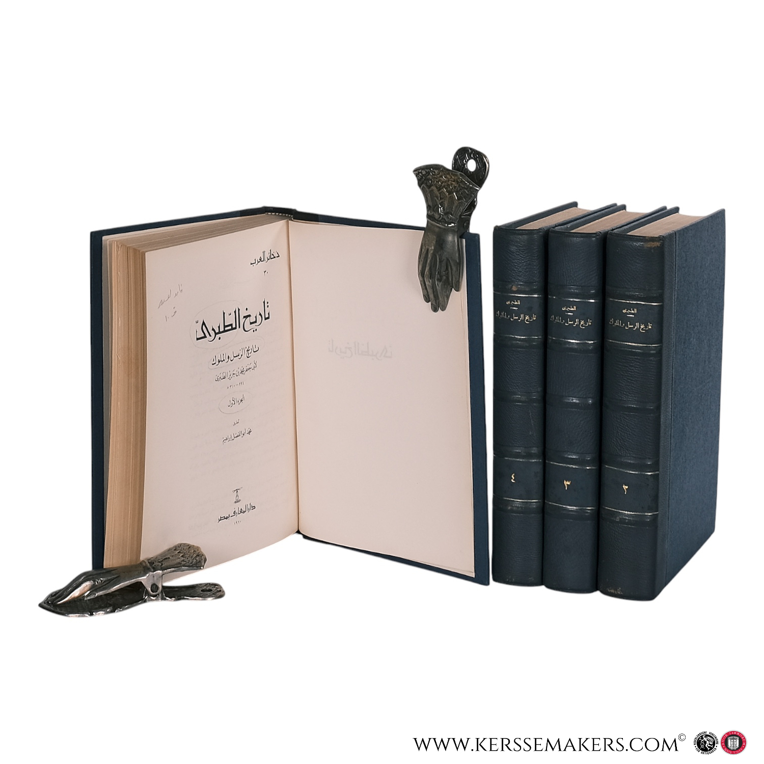 25 x 18 cm, blue half leather with gilt titles on the spines, four volumes. Text in Arabic. A critical edition of Al-Tabari's monumental chronicle on the history of prophets and kings, edited by Muhammad Abu al-Fadl Ibrahim. Volumes published between 1960 and 1963. The bindings show minor wear, with some scuffing. Pages lightly age-toned. Ex-libris stamp in each volume. Very good. See pictures. Weight is 4.7 kg.