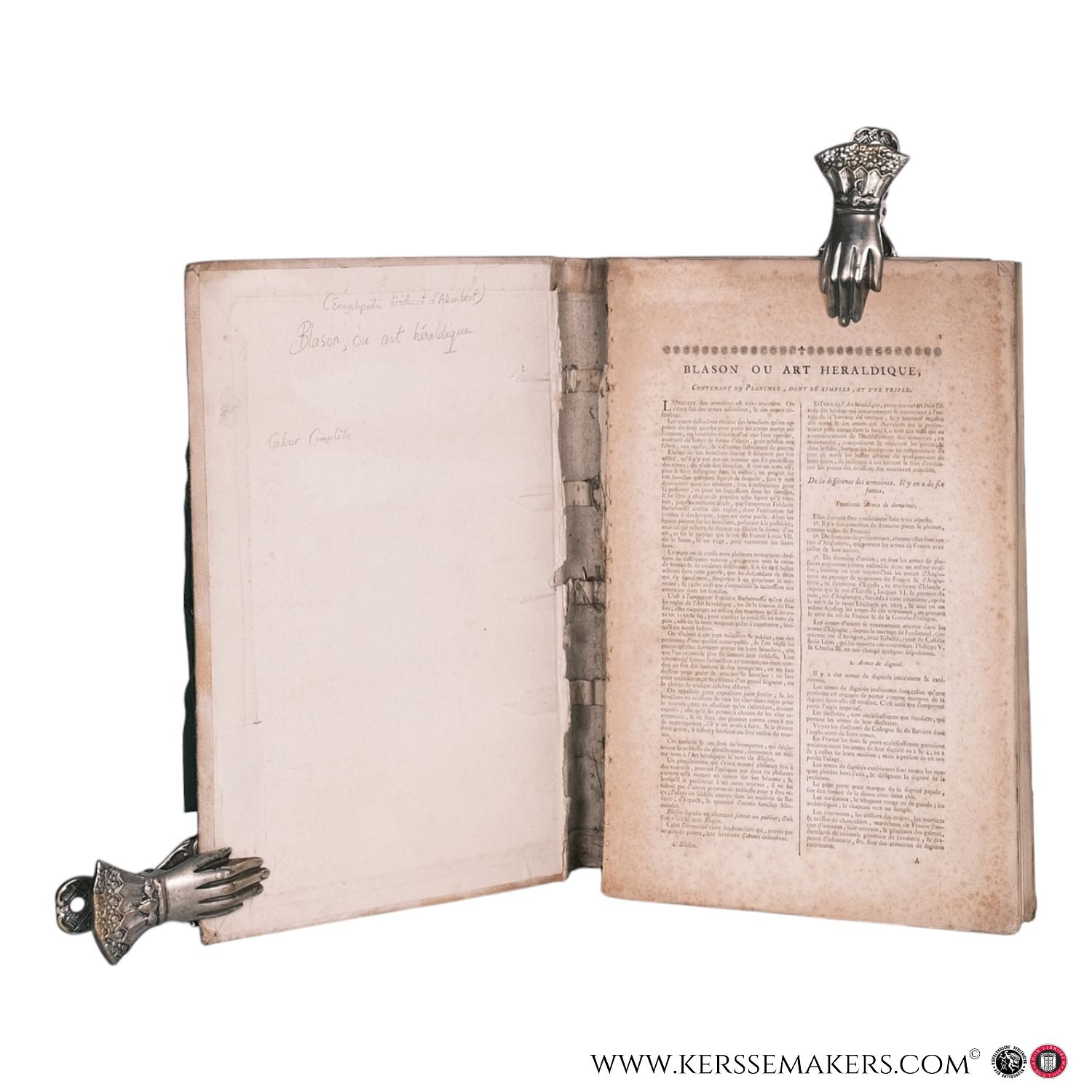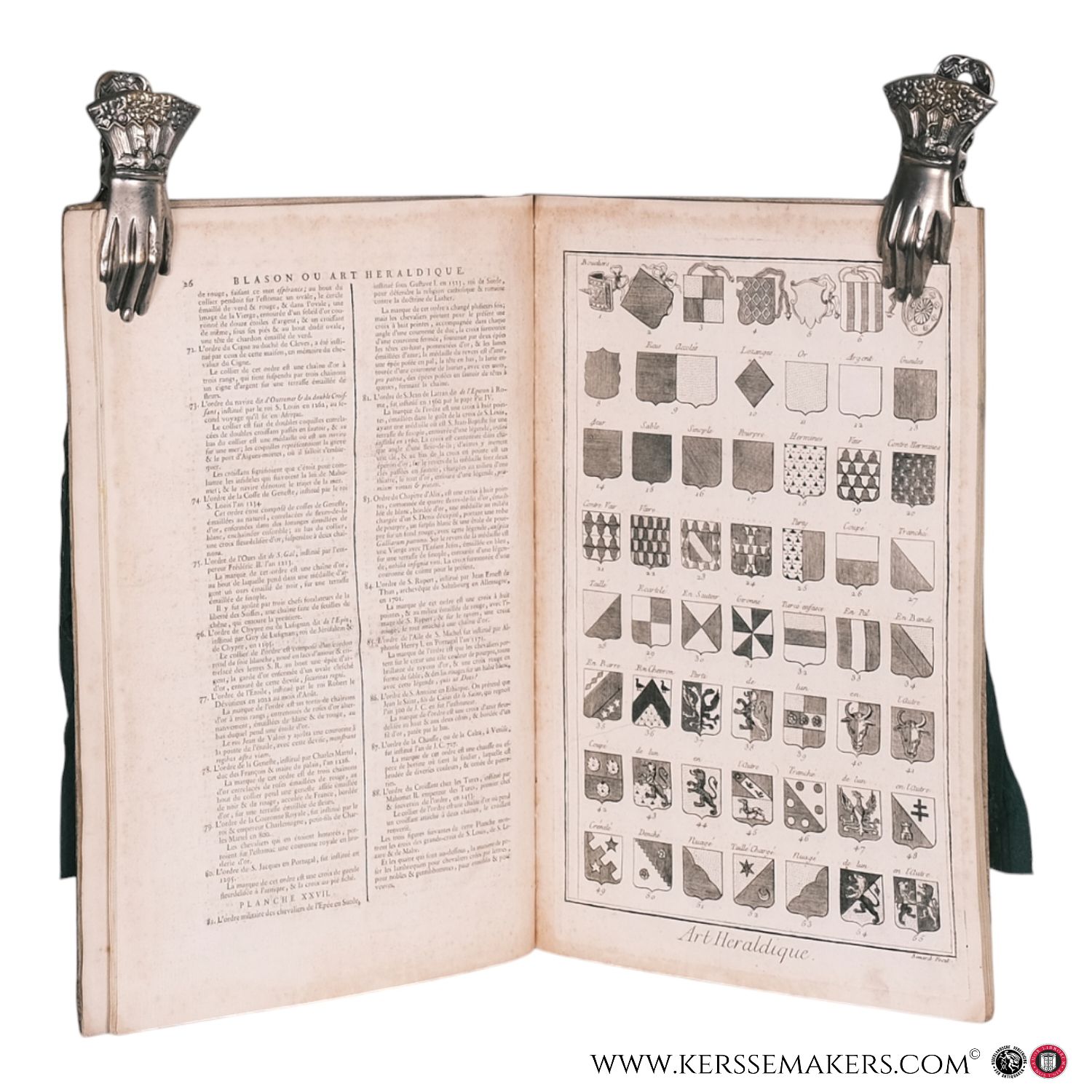 Folio (39x25 cm). Contemporary portfolio (removed vellum binding)(a bit warpled). Loosely inserted 26 pp. text, printed in 2 columns (some textleaves soiled) and 33 engraved plates "Art Héraldique", numbered 1-27, including 1 threefolt plate and 6 Supplement plates "Blasons" (geometrical drawings), no 1-6. All the plates engraved by Benard - Complete section, but sub-title missing.