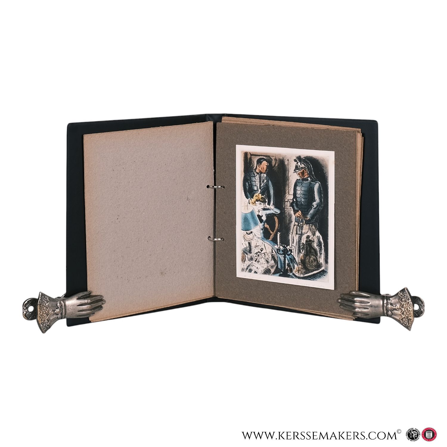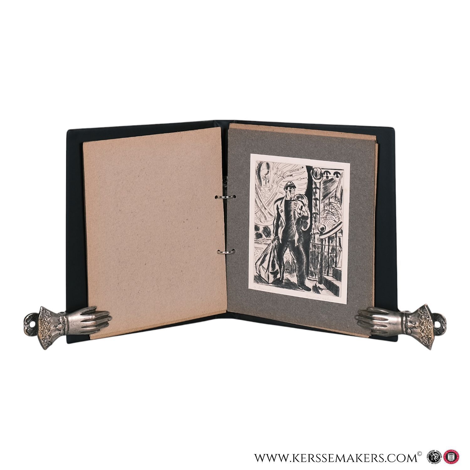 Multi-ring binder (29x23 cm). With 16 etchings (19,5x14,5 cm) pasted on cardboard leaves. - Part of the series printed by Les Ateliers de l'imprimerie en taille douce de la Roseraie on "vélin de Rives" in 350 copies for Tristan Bernard 'Amants et Voleurs'. The etchings executed in 2 states: in black and in colour are signed and titled in pencil by the artist André Dignimont: 1) Le poignard malais. - 2) Lettre d'amour. - 3) Nicolas Glave. - 4) Edmond. - 5) jEn casque et sabre. - 6) Hardi, Poitvin! - 7) La visite des bagages. - 8) Un guerrier.