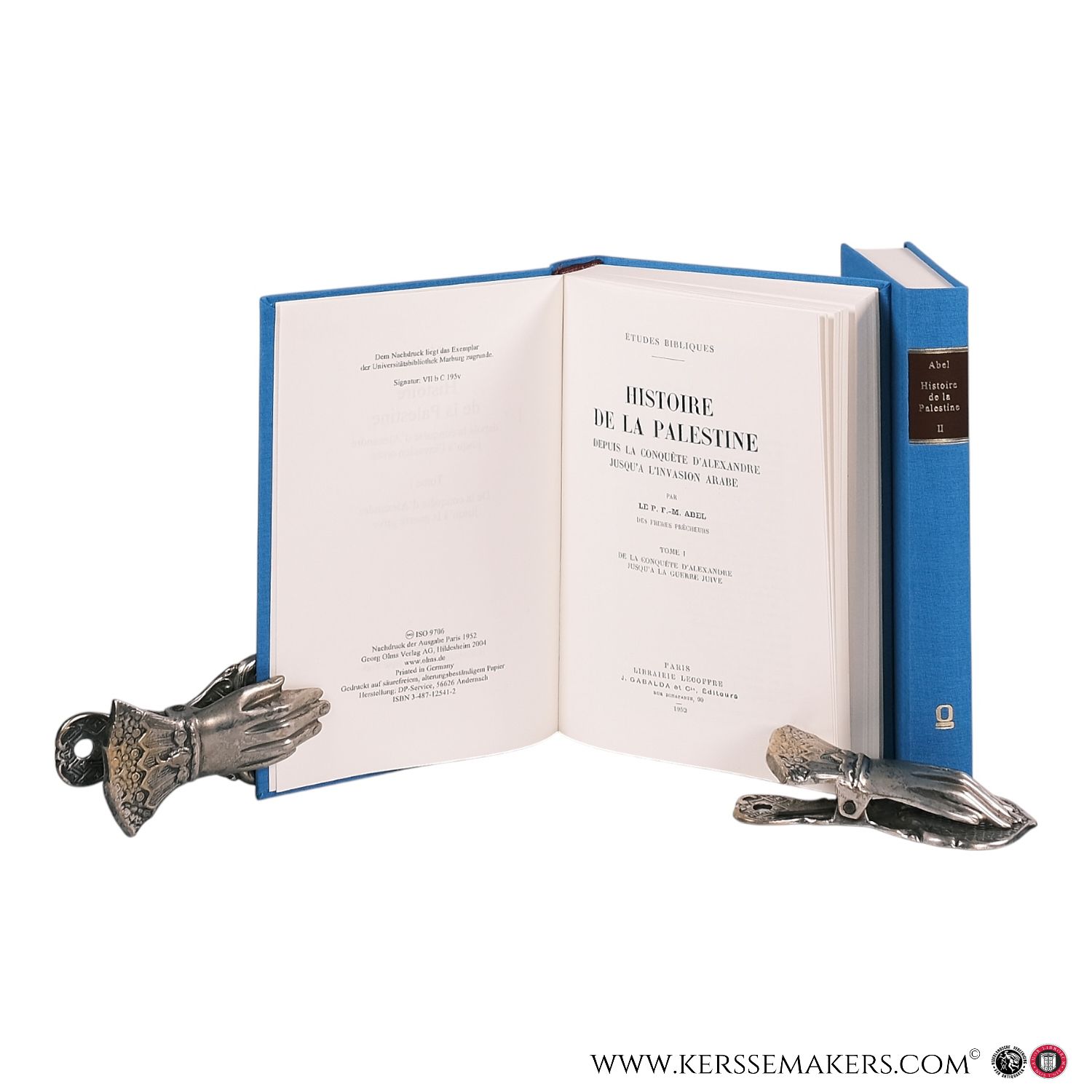 22 x 15.5 cm, blue cloth hardcovers, 2 volumes, xvi, 596, (2) ages, x, 406 pages with 4 folding maps, text in French. Reprint of the original Paris editions from 1952. Based on all available sources, Félix-Marie Abel -Dominican, biblical scholar, archaeologist, and geographer who spent many years in Jerusalem- examines the political history of Palestine from Alexander the Great to the Arab invasion. Original price 316 euro. Very good/ fine condition, see picture.