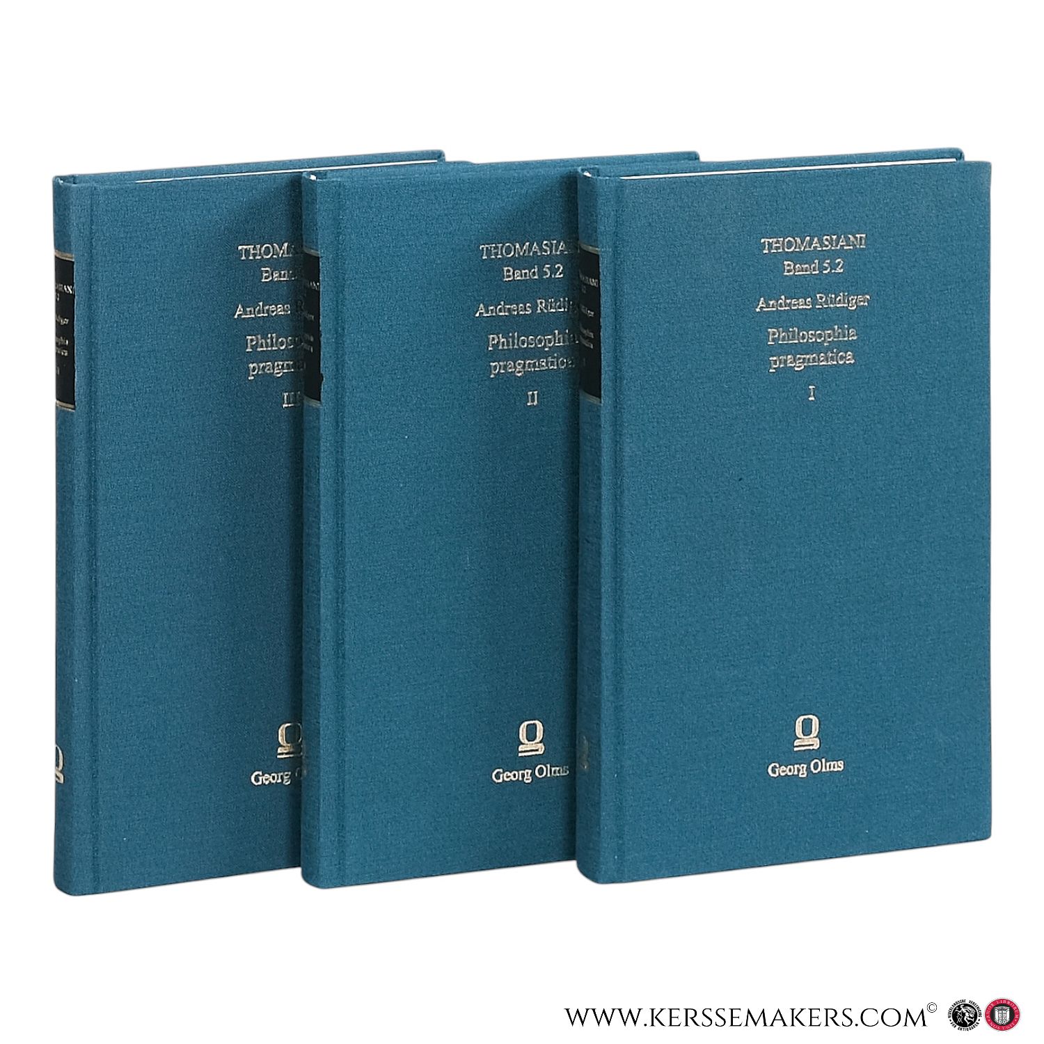 20.5 x 12.5 cm, green cloth hardcovers, 3 volumes, together 12, [13], 875, [24] pages, part of the series " Thomasiani ", volume 5.2, text in Latin. Reprint of the original Leipzig edition from 1723. In his Philosophia pragmatica, Rüdiger presents his reconstruction of philosophy based on both internal and external experience, as well as his epistemological and methodological concept of metaphysics. Rüdiger, perhaps the most significant and independent student of Christian Thomasius, was the first within German university philosophy to conceptualize philosophy -especially metaphysics- as an "empirical science." This work starts with epistemology as the foundation for all philosophical knowledge, concept formation, and methodology. Rüdiger's influence extended through his students August Friedrich Müller and Adolph Friedrich Hoffmann to Christian August Crusius, ultimately shaping the early thinking of Immanuel Kant. Original price 354 euro. Very good/ fine condition, see picture.