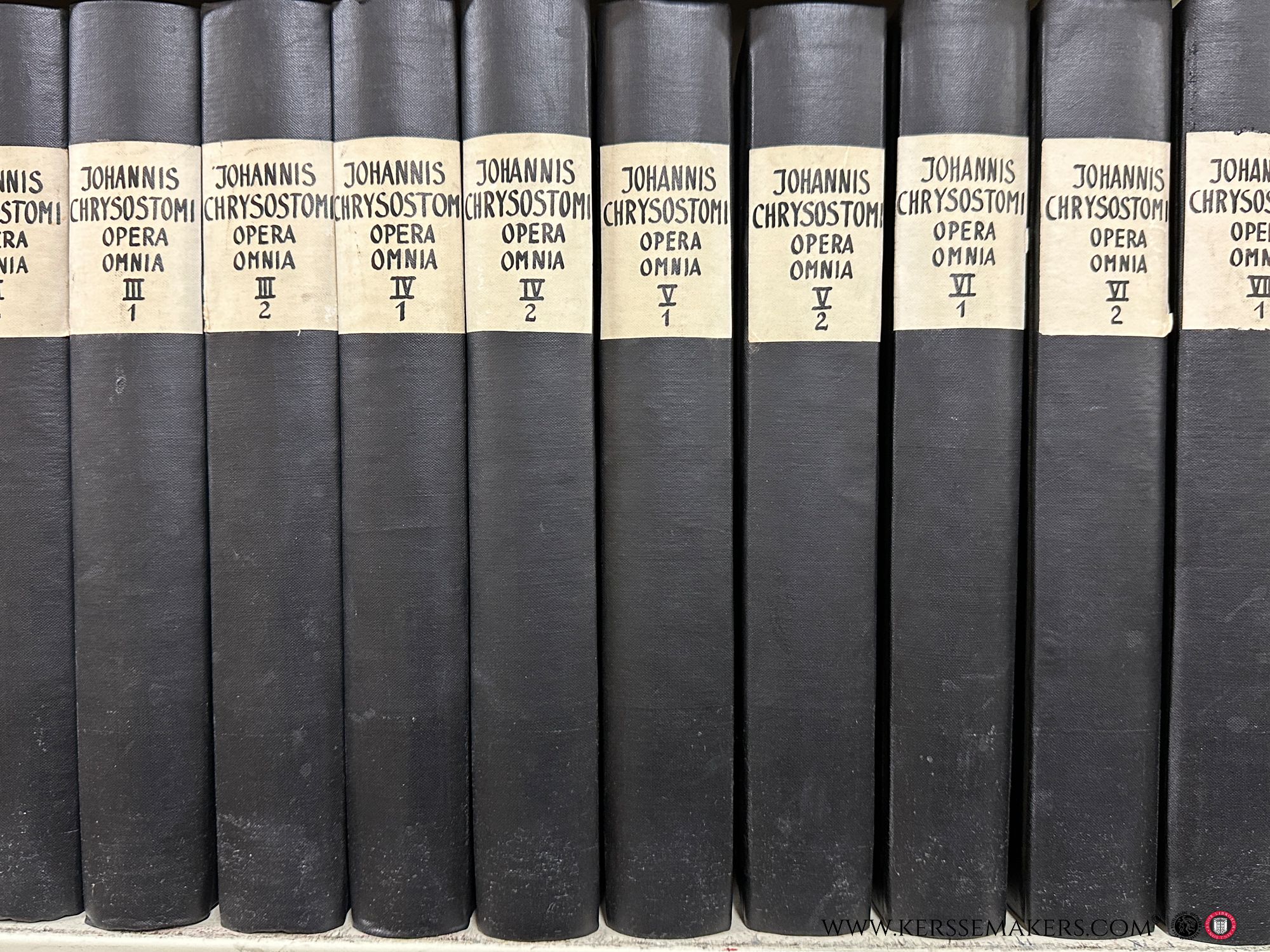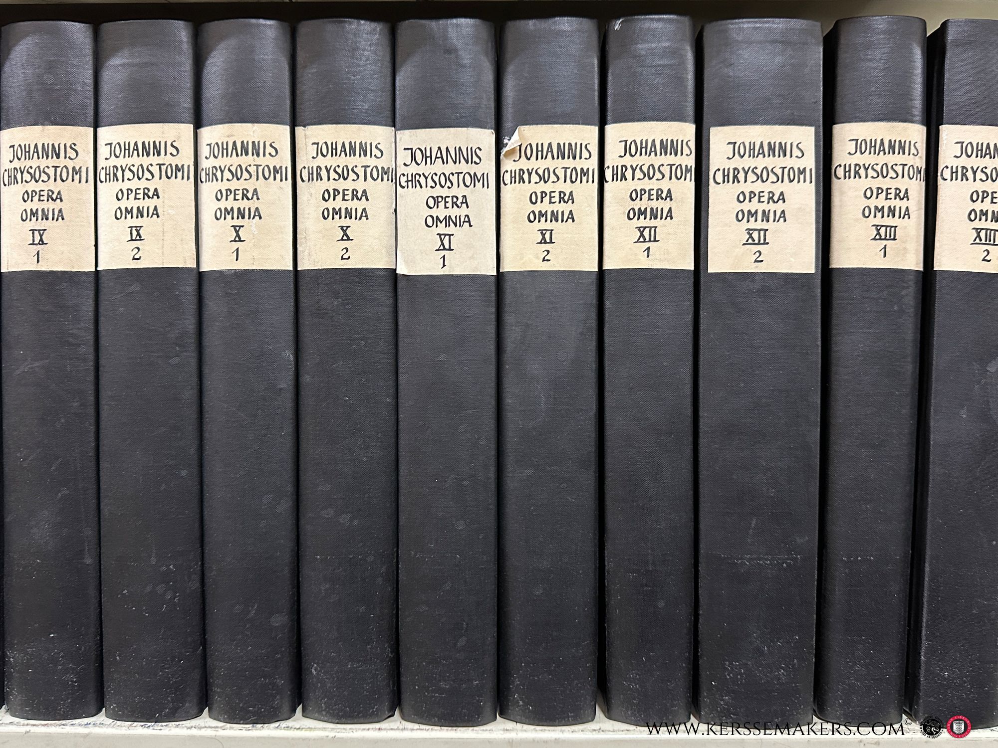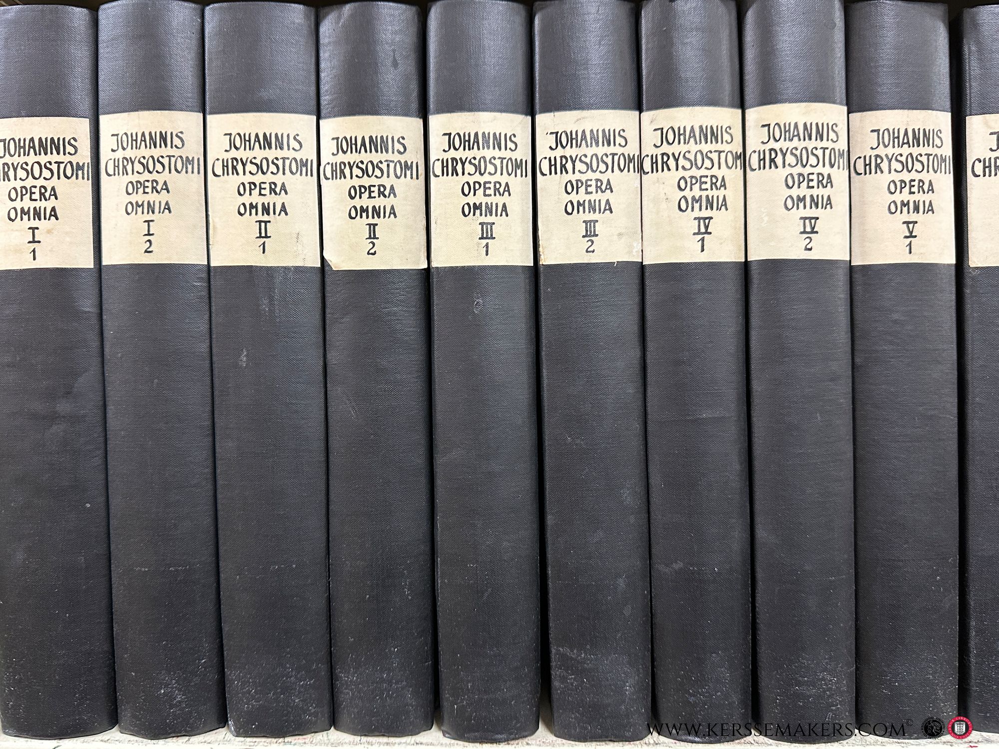 13 volumes in 26 bindings, Greek and Latin parallel text. Edited by Bernard de Montfaucon. Scholarly edition of the complete works of John Chrysostom, based on various manuscripts including Vatican, Parisian, and German sources, with extensive notes, indices, and appendices. Black cloth bindings with paper spine labels. Text in Greek and Latin. Foxing throughout, some library stamps, bindings with some wear. See pictures.