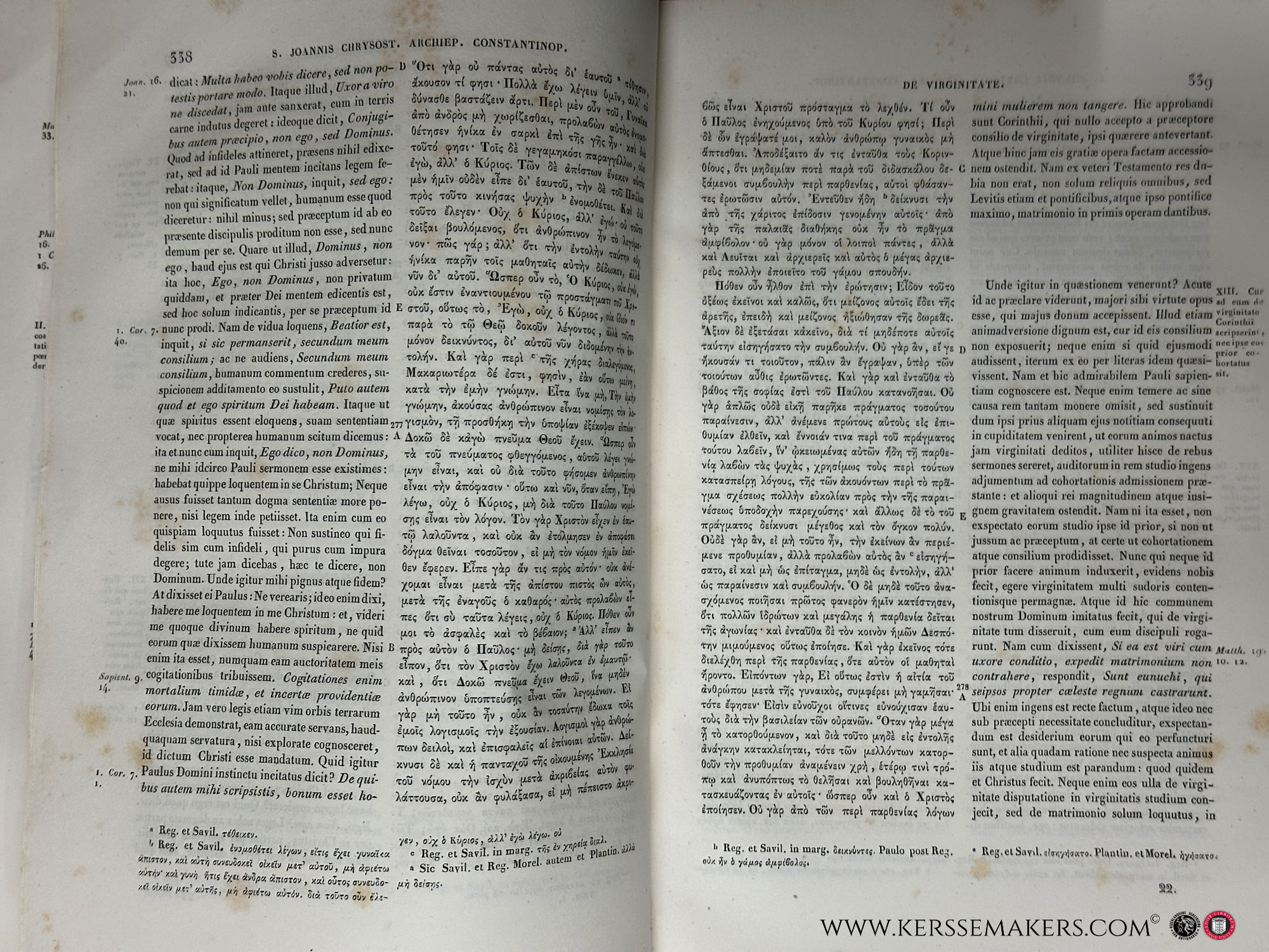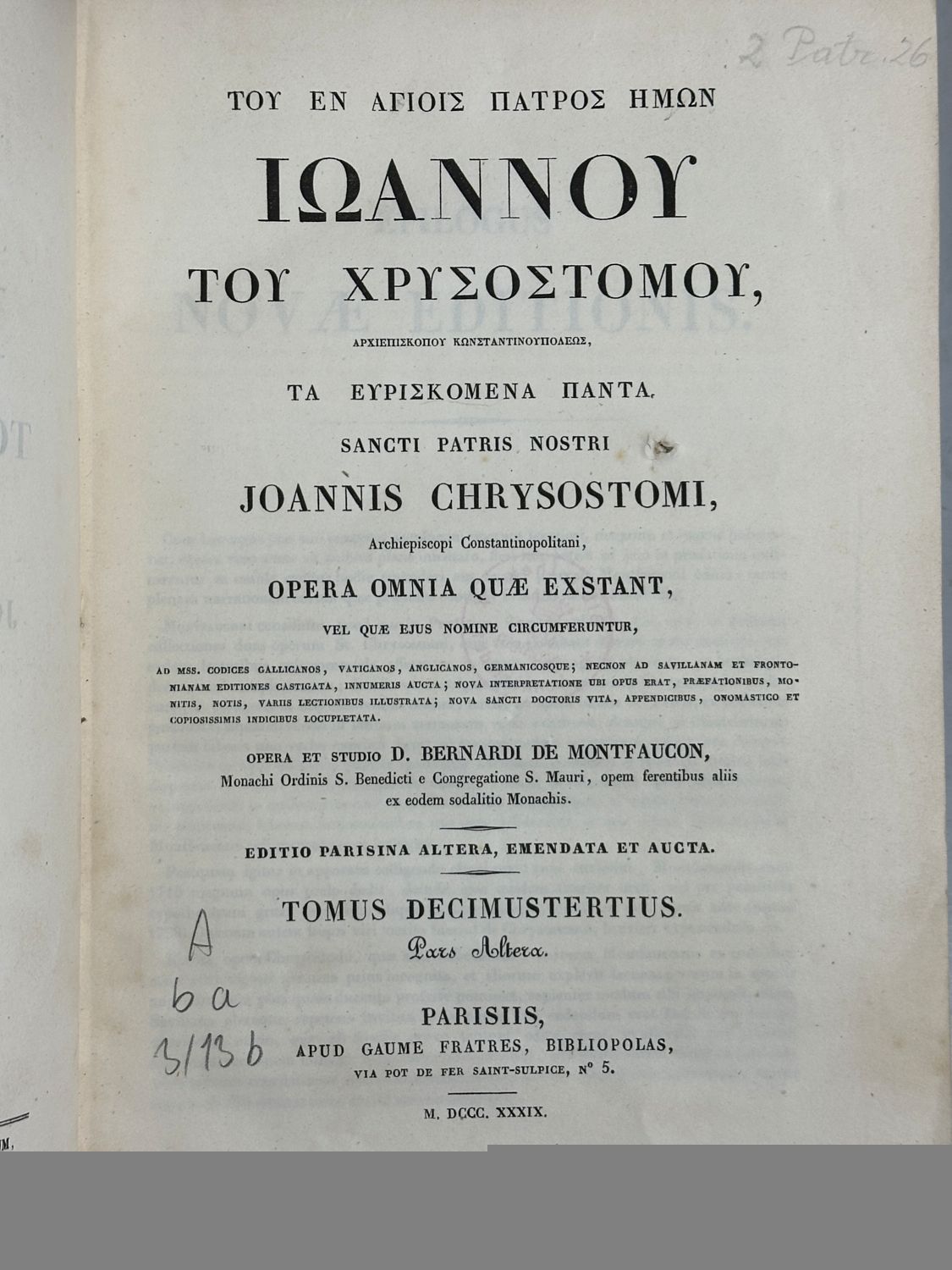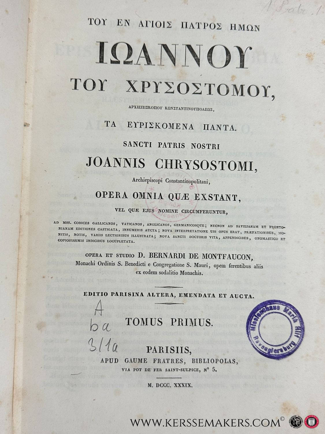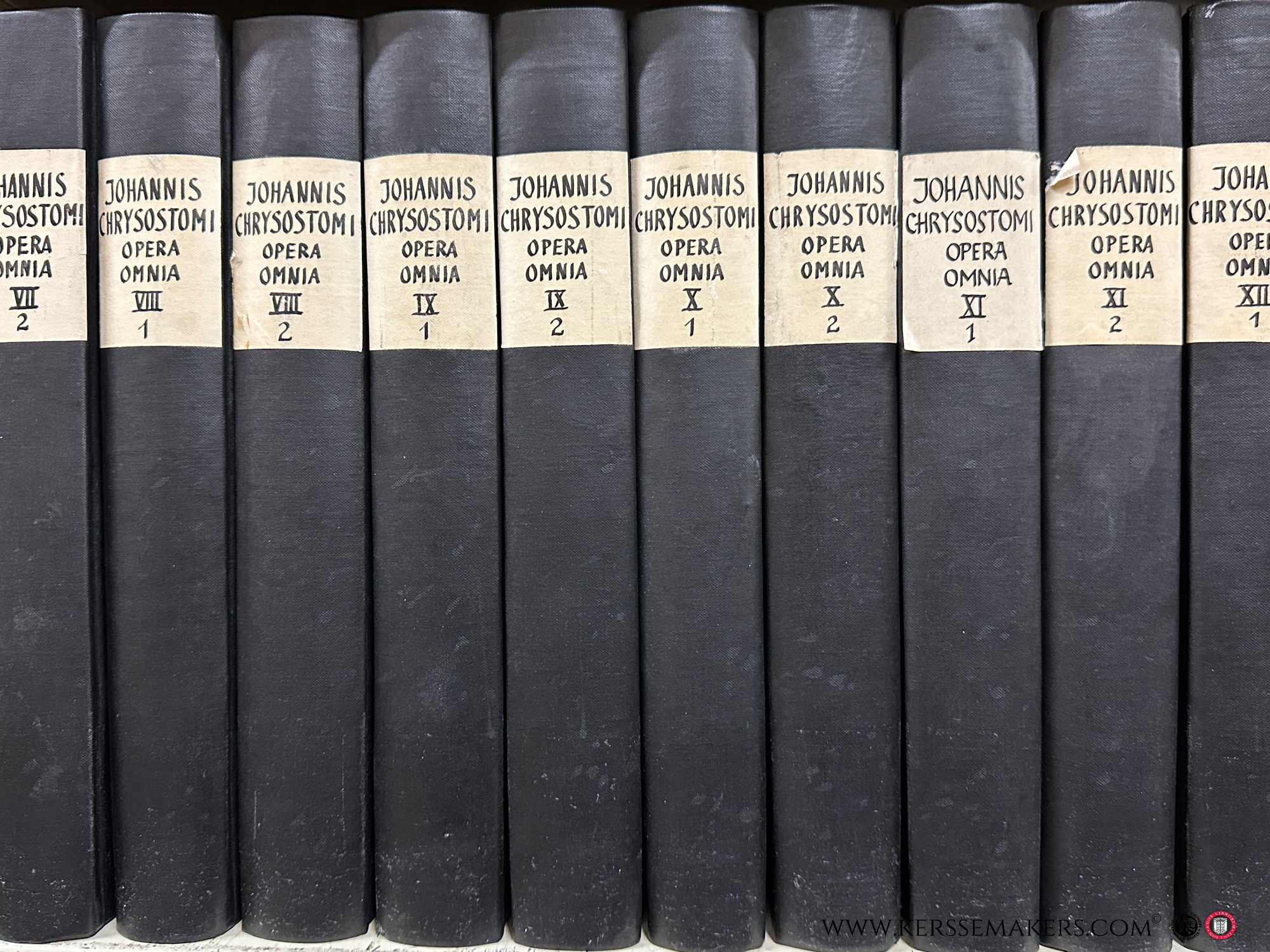 13 volumes in 26 bindings, Greek and Latin parallel text. Edited by Bernard de Montfaucon. Scholarly edition of the complete works of John Chrysostom, based on various manuscripts including Vatican, Parisian, and German sources, with extensive notes, indices, and appendices. Black cloth bindings with paper spine labels. Text in Greek and Latin. Foxing throughout, some library stamps, bindings with some wear. See pictures.