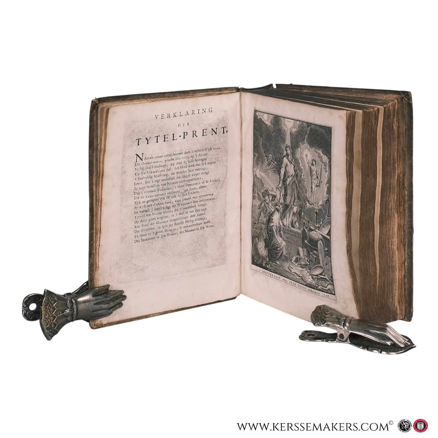26.5 x 21.5 cm. Bound in contemporary blind-stamped vellum over wooden boards, spine with raised bands. [10] unnumbered pages including half-title, engraved allegorical title page, title page printed in red and black, and author's portrait; 916 pages; 18-page index. Illustrated with 28 folding engraved plates at the end, depicting subjects such as human anatomy, cosmography, physics, and natural history. Text in Dutch. Contains an early ownership inscription dated 1908 by A. de Bruijne and a red stamp of J. van Straalen, Rotterdam. Binding worn and partially split at joints. Paper somewhat browned with occasional foxing; plates complete, see pictures.