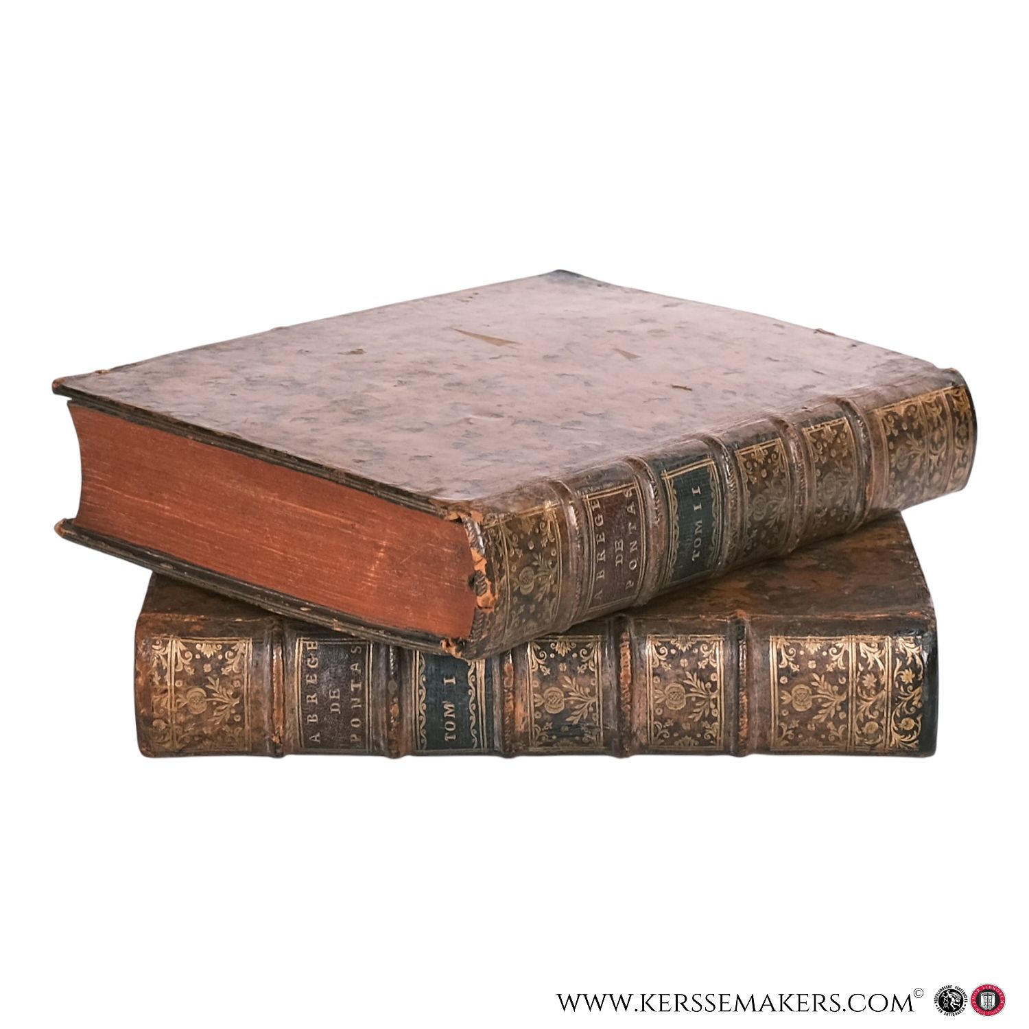 26 x 21 cm. 2 volumes. Contemporary full mottled calf bindings with raised bands, gilt floral tooling on spine, and red edges. Text in French. Hinges a bit weak, some foxing and spotting, otherwise solid and complete. See pictures.