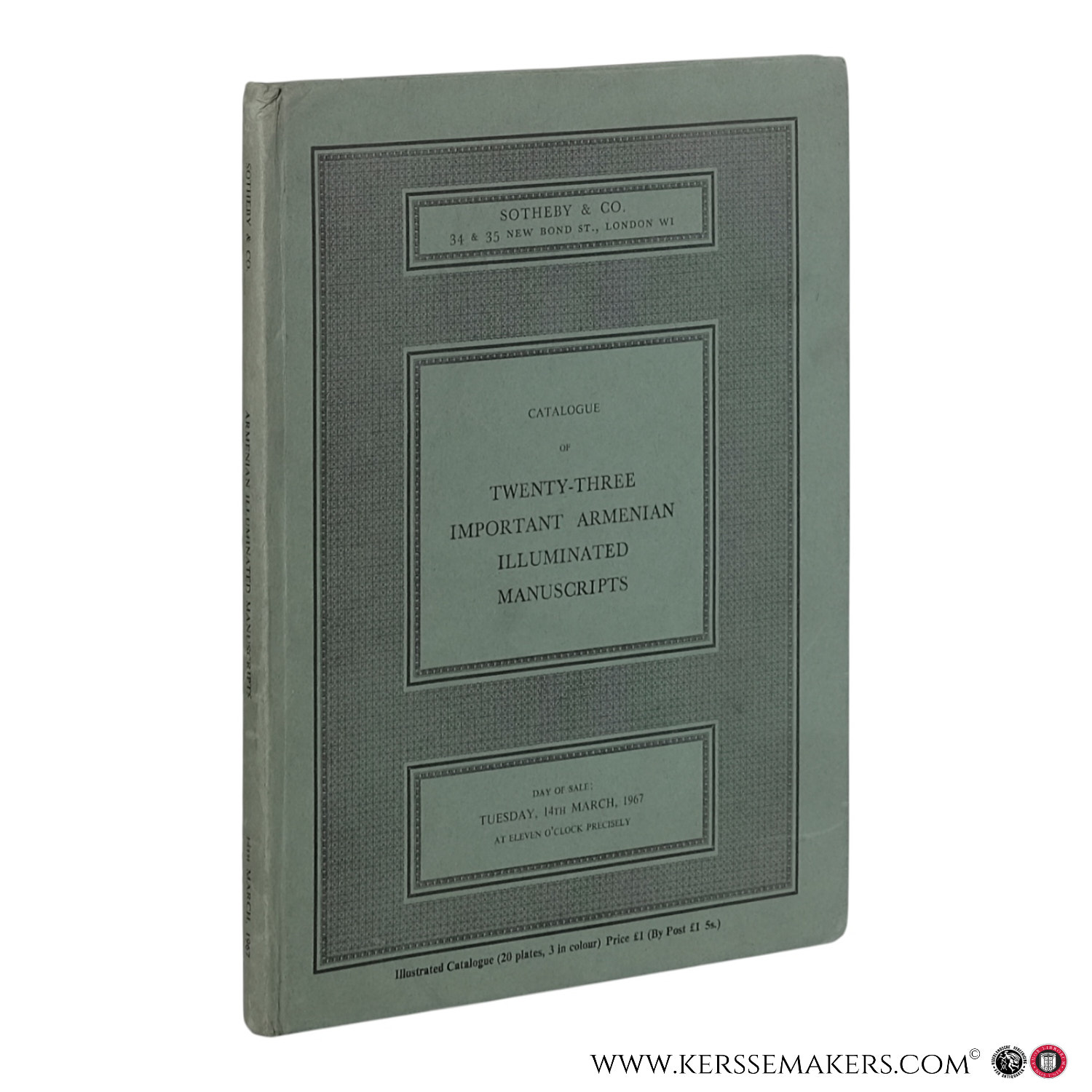 Auction catalogue for the sale held on Tuesday, 14th March 1967 at Sotheby's, 34 & 35 New Bond Street, London. Describes 23 important Armenian illuminated manuscripts with detailed notes on provenance, date, and iconography. A rare and scholarly catalogue of high bibliographic and historical interest.