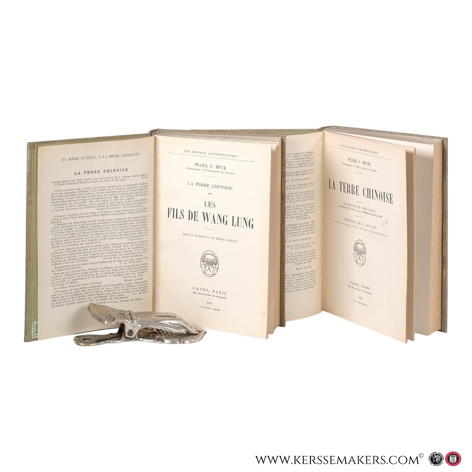 19 x 14 cm. Later uniform cloth bindings, 376,(6) pages & 400 pages, both from the series 'Les romans documentaires. French translations of "The Good Earth" and "Sons". Paper slightly browned, few underlinings in pencil, bindings clean and solid, still very good set. See picture.