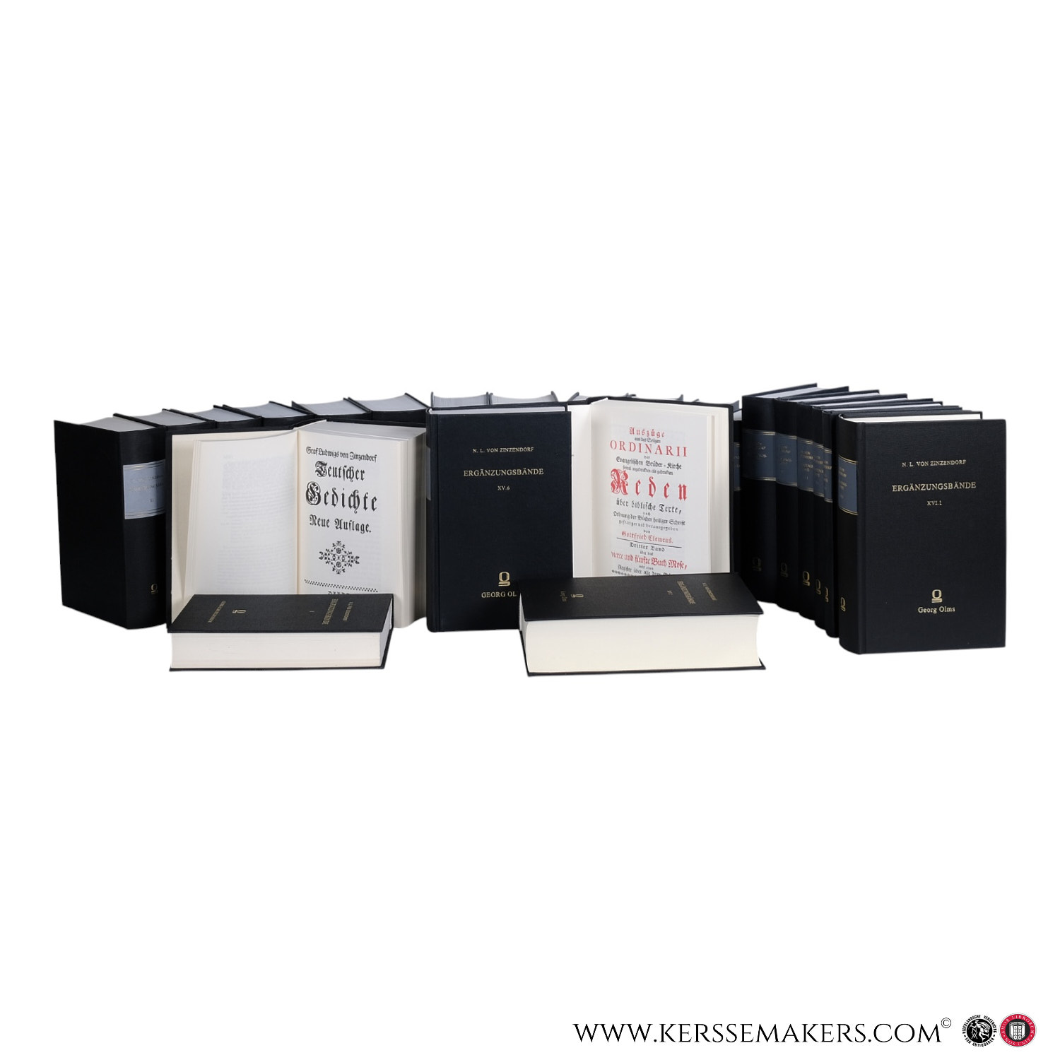 Complete set of the Ergänzungsbände to the Hauptschriften of Nikolaus Ludwig von Zinzendorf, containing genealogical studies, theological treatises, sermons, collections of writings, correspondence, reprints of rare editions, and critical studies. Includes among others: Meyer, Nikolaus Ludwig Reichsgraf von Zinzendorf und Pottendorf. Eine genealogische Studie; Zinzendorf, Teutsche Gedichte (1766) with supplements; Spangenberg, Apologetische Schluß-Schrift (1752); Theologische und dahin einschlagende Bedencken (1742); Gestalt des Creutz-Reichs Jesu (1745); Büdingische Sammlung (1742–1745); Meyer, Zinzendorf und der Katholizismus; Freywillige Nachlese (1740); Berliner Reden (1738); Reden über die vier Evangelisten (1766–1792); Reden über biblische Texte (1763–1765). Series: Ergänzungsbände zu den Hauptschriften Band I–XVI. Publisher’s original price: € 2,951.80.