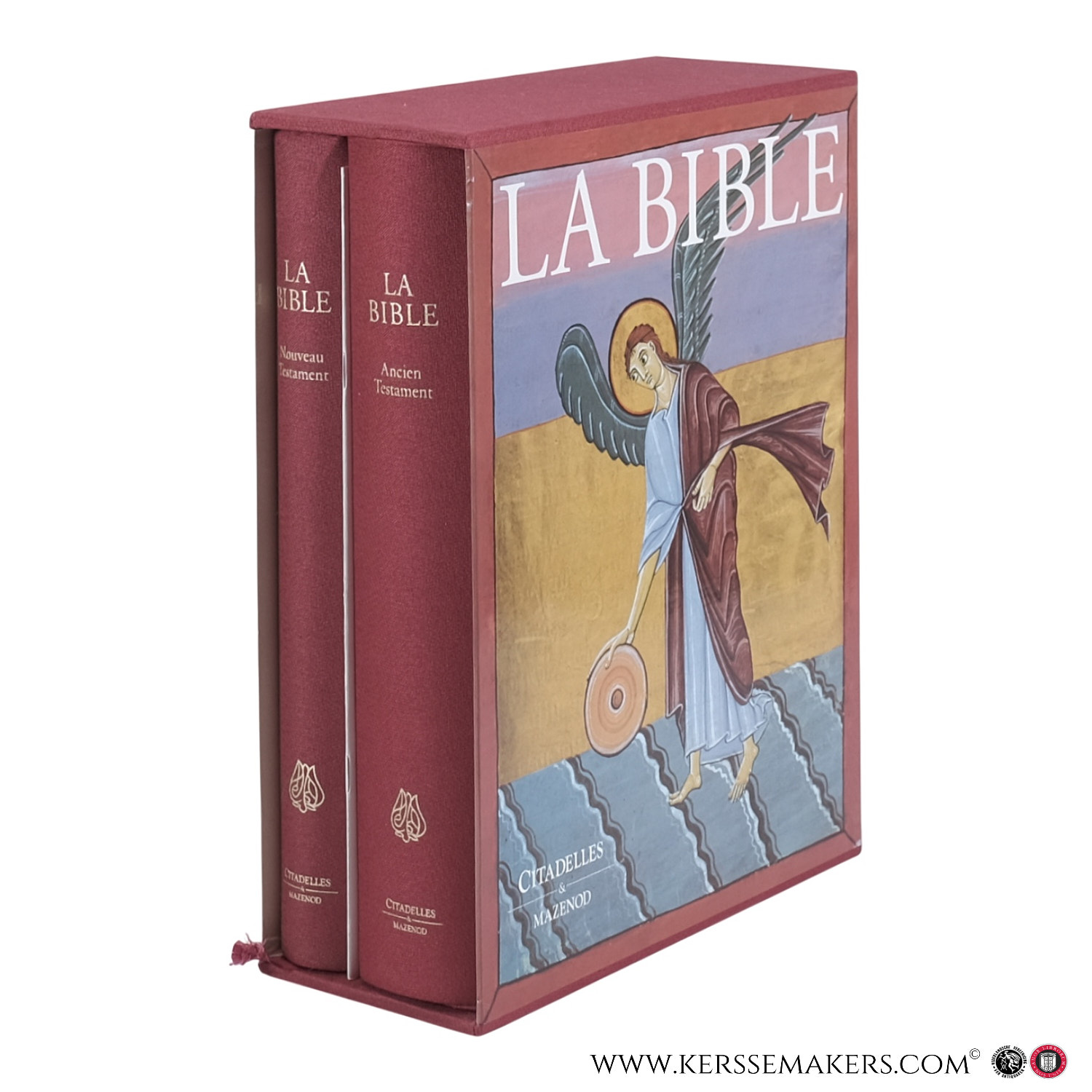 Illustrated edition of the Bible de Jerusalem accompanied by reproductions of medieval illuminations from the 6th to the 12th century. Two red cloth volumes with a separate index booklet in a slipcase.